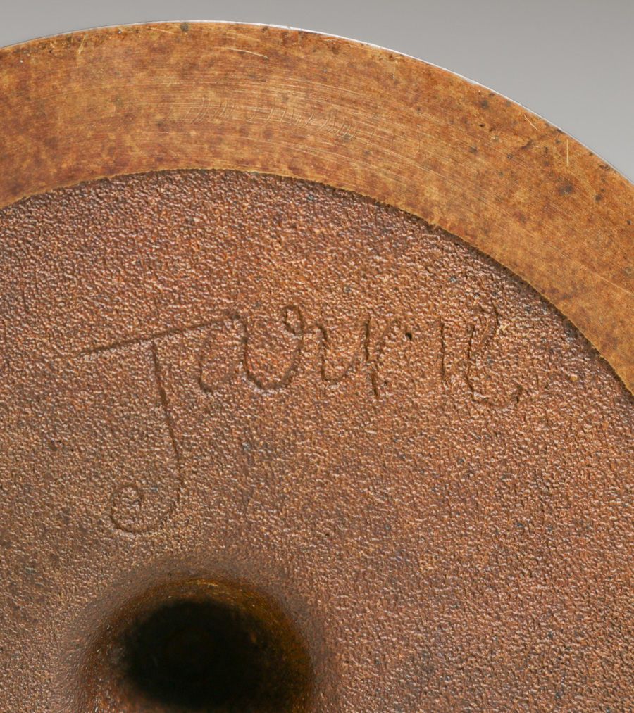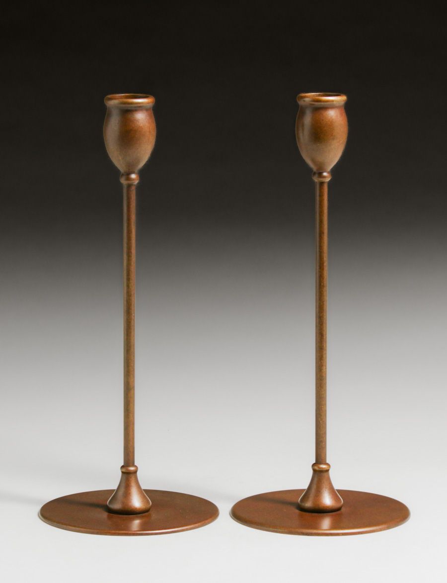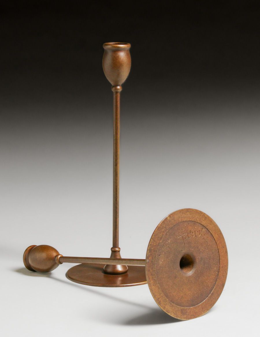Jarvie – Chicago “Alpha” Bronze Candlesticks c1910. Signed. Excellent new patina. 11.25″h x 4 7/8″d