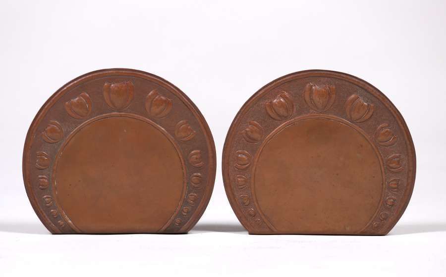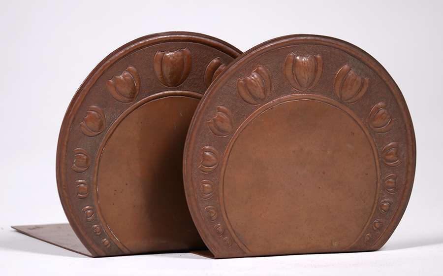 Jarvie hammered copper bookends with repousse floral design. Signed. Excellent original patina. 4.75"h x 5.5"w SOLD