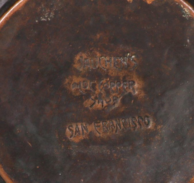 Jauchen's Old Copper Shop hammered copper miniature jardiniere. Signed. Excellent original patina. 4"d x 2.75"h SOLD