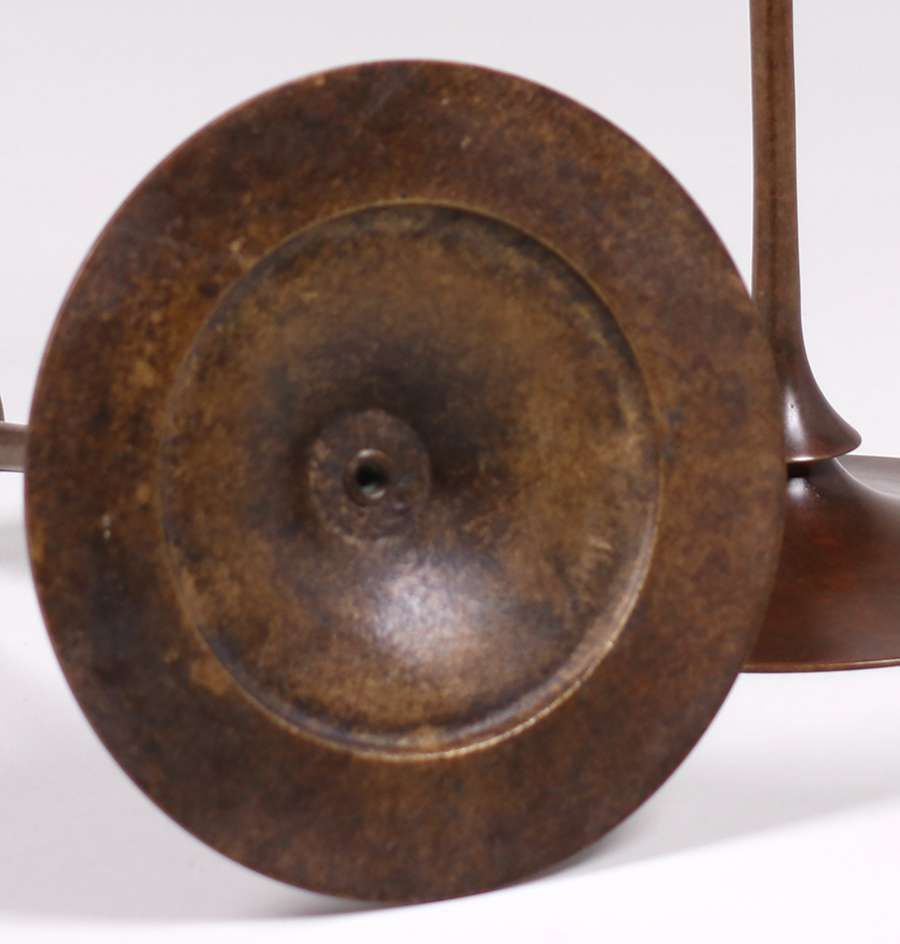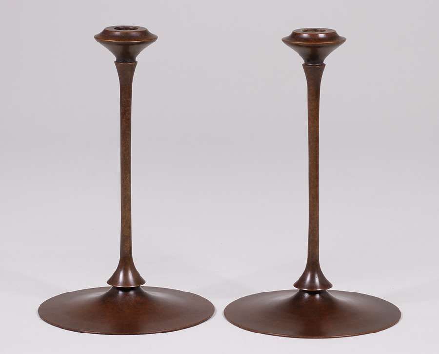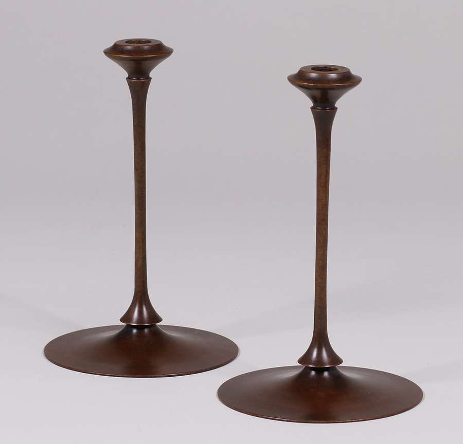 Pr Jessie Preston -attributed- Prairie School candlesticks c1910. Excellent new patina. Unsigned. 12.75″h x 7.75″d SOLD