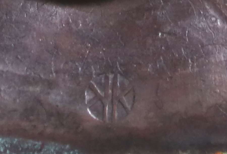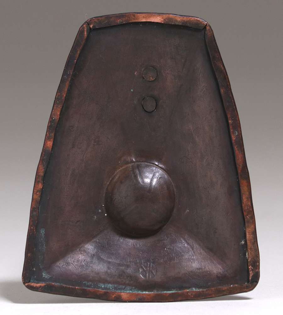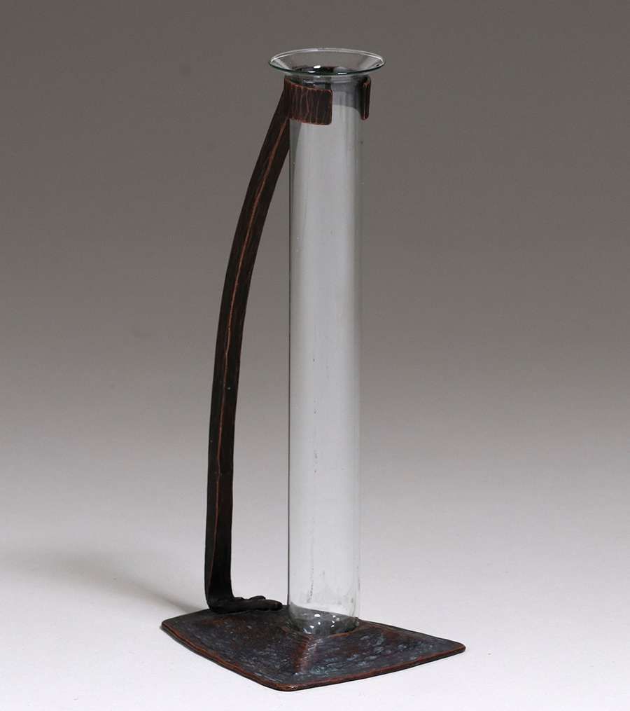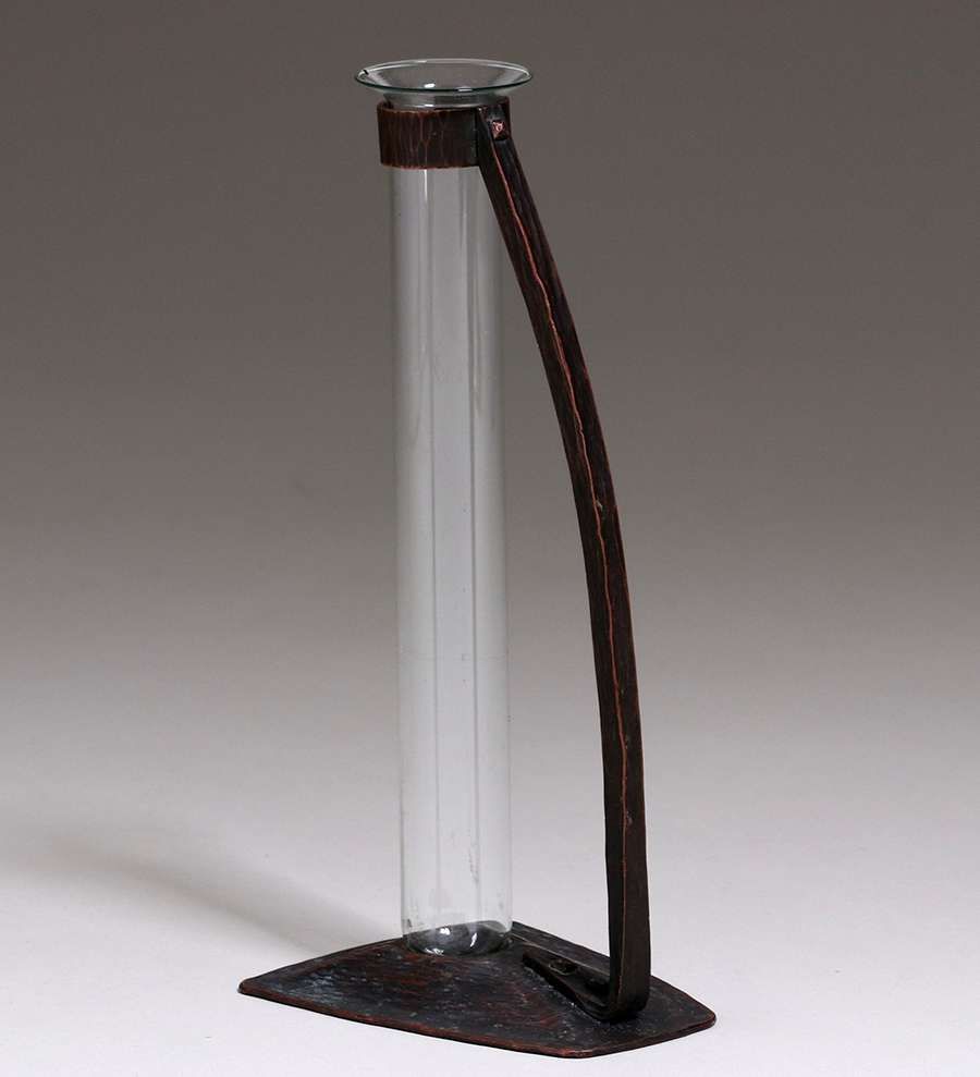 Karl Kipp hammered copper stem vase. Signed with KK mark. Excellent original patina. Glass vase not original. 8"h x 3.25" x 3.75" SOLD