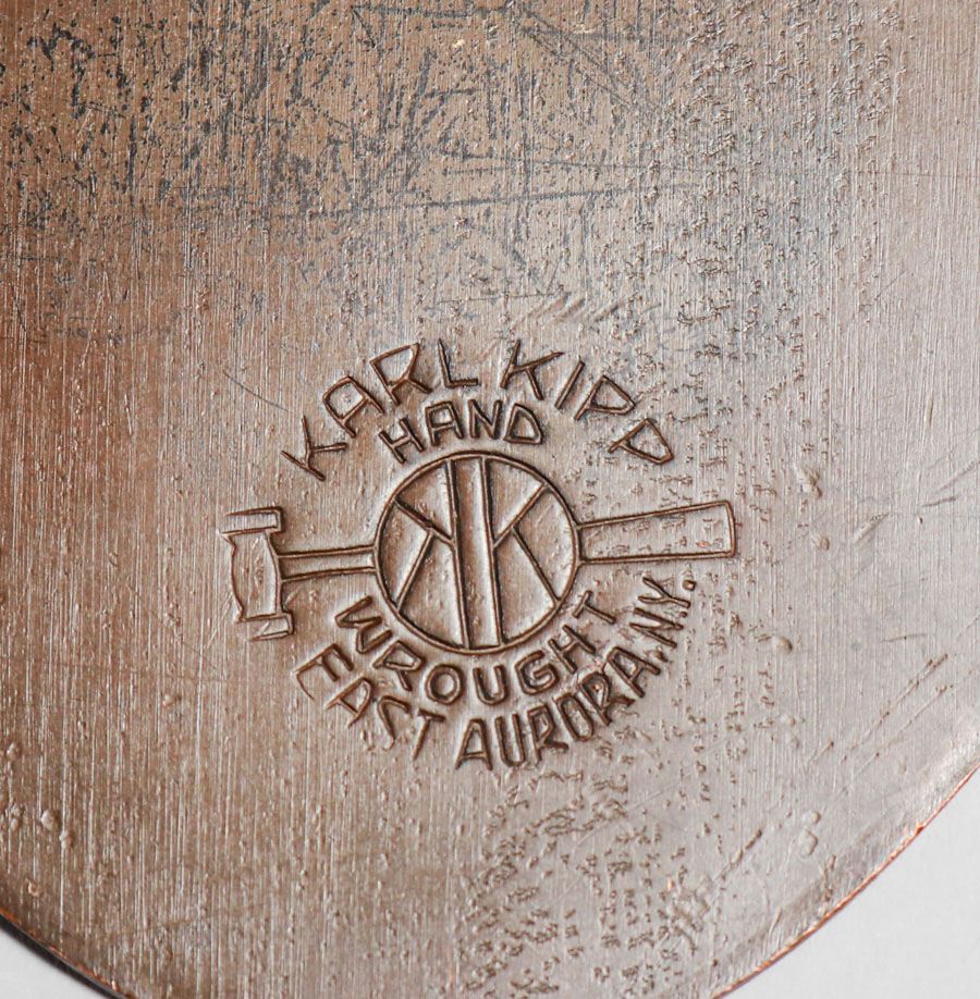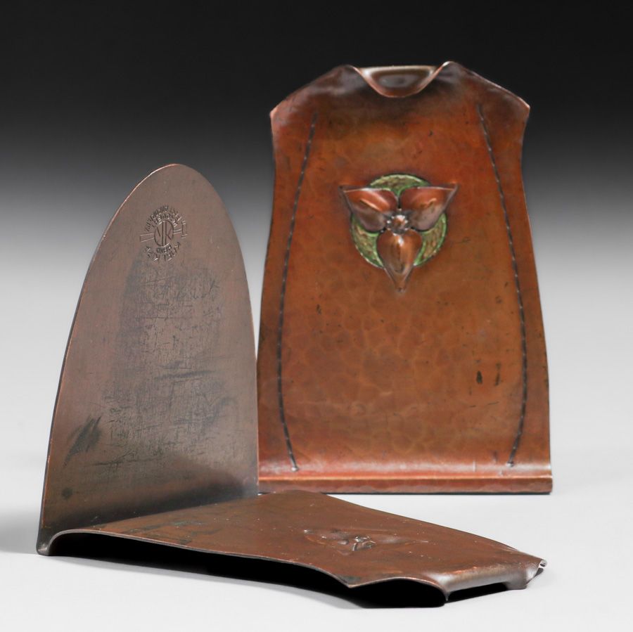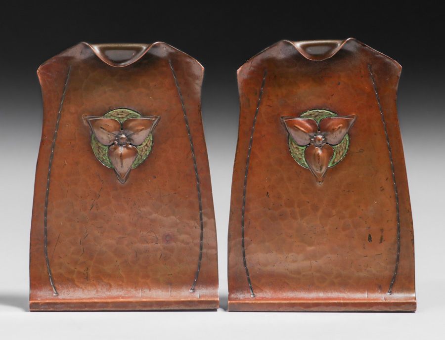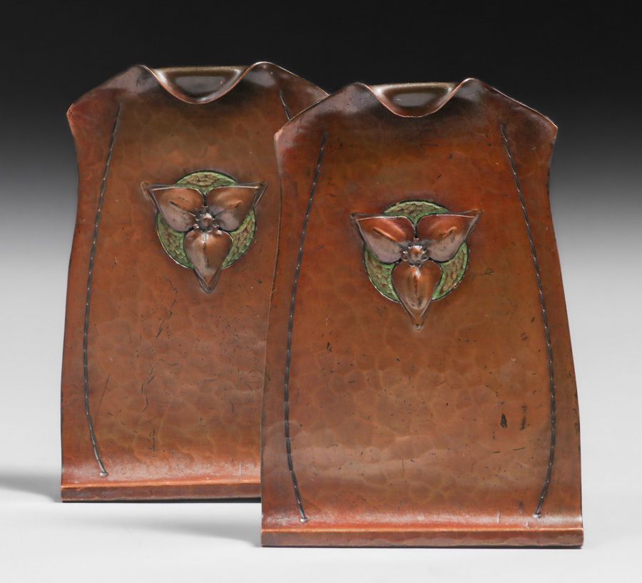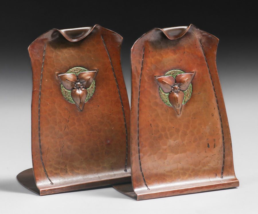 - Karl Kipp Tookay Shop Hammered Copper Polychrome Bookends c1915
