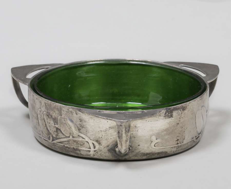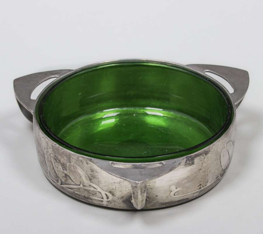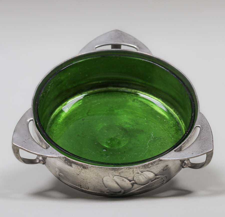 Liberty & Co Archibald Knox Pewter Three-Handle Bowl c1905. Signed. Excellent original patina. Original glass liner in perfect condition. 5.5"d x 1.5"h SOLD