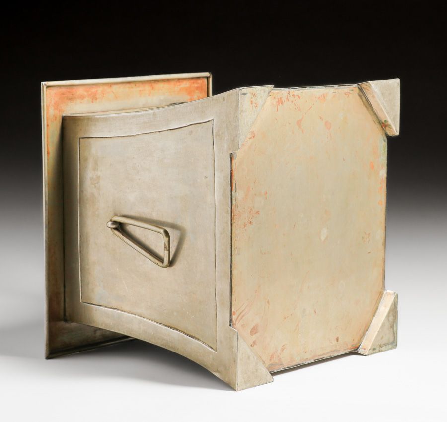 Margaret Gilmour – Glasgow Hammered Copper Silver-Plated & Enamel Mackintosh Rose Jardiniere c1900s. Unsigned. Excellent condition. 10"h x 11.5" x 11.5"