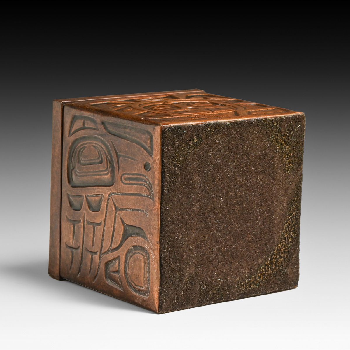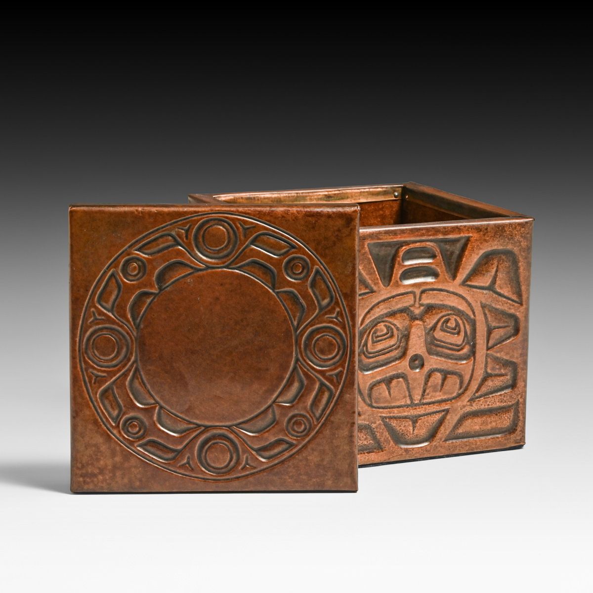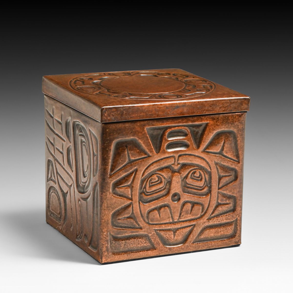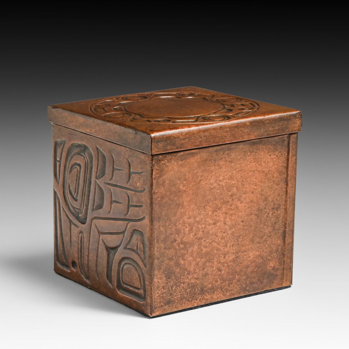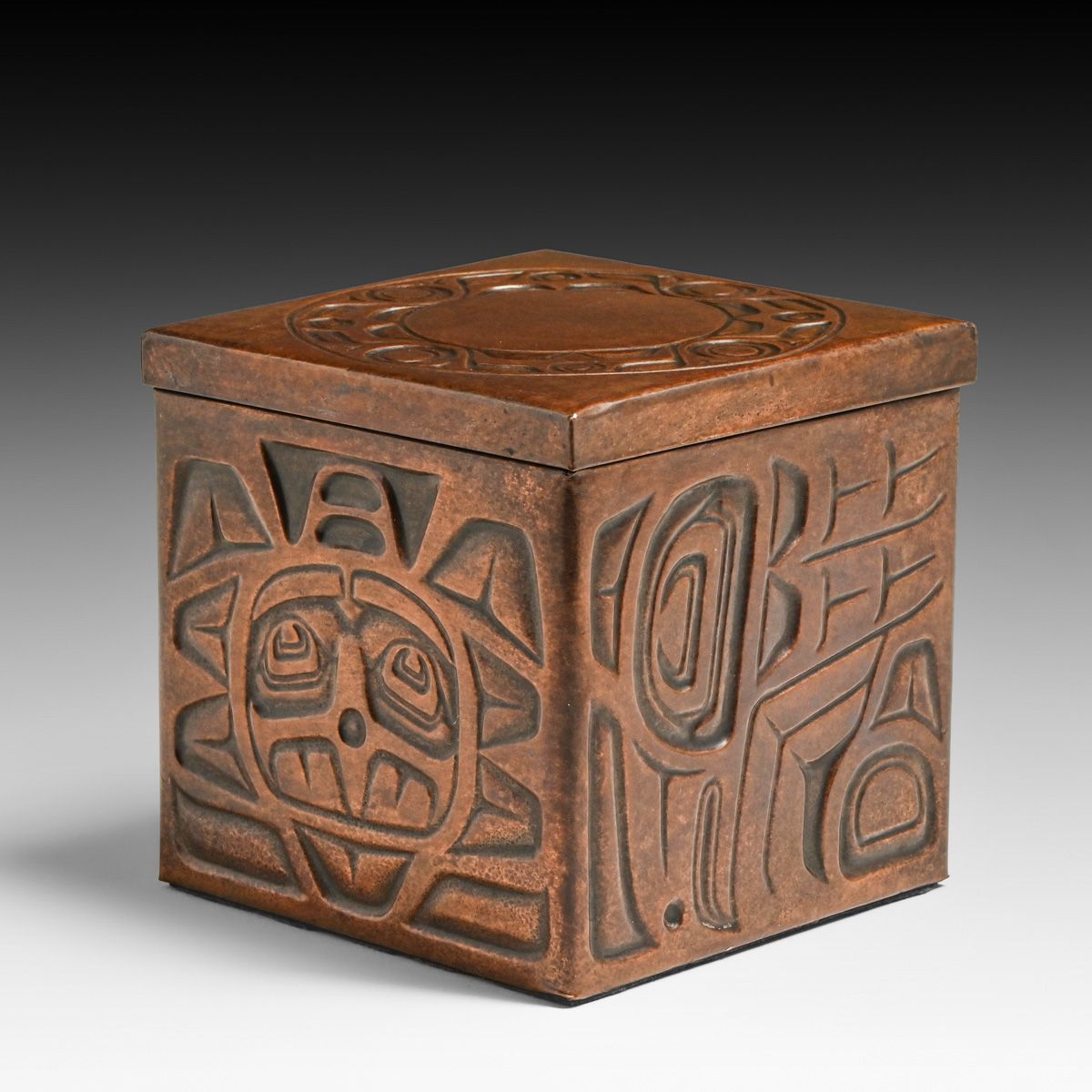 Northwest Coast Nuxalk Tribe Embossed Copper Box c1990s. Unsigned. Excellent new patina. 4.75" x 4.75" x 4 5/8"h