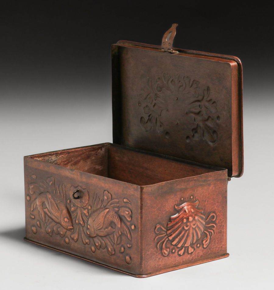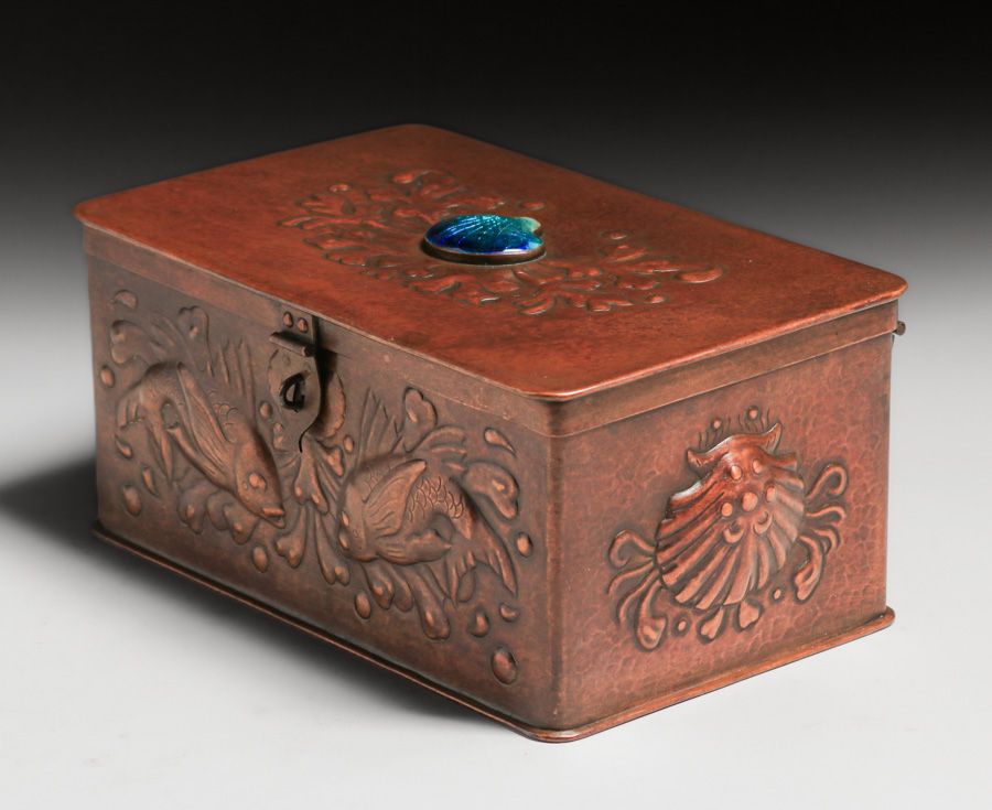 Newlyn Hammered Copper & Enamel Fish & Sea Creature Box c1900. Newlyn copper pieces with enamel are extremely rare. Signed. Excellent new patina. 8.5"w x 5.25"d x 4.25" SOLD