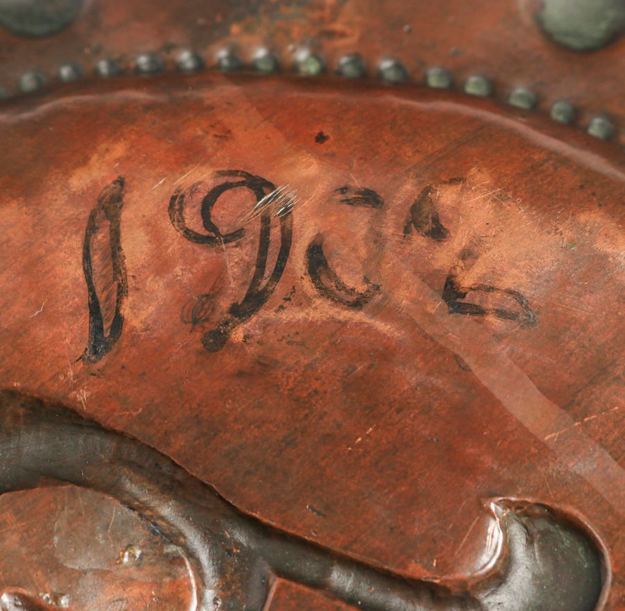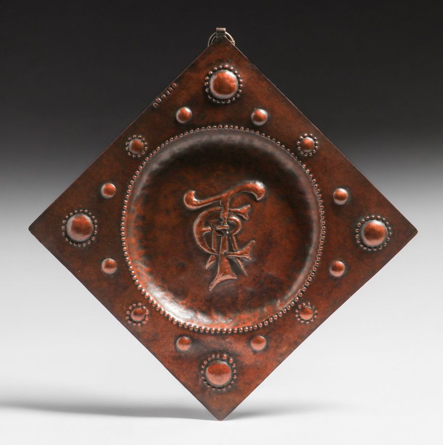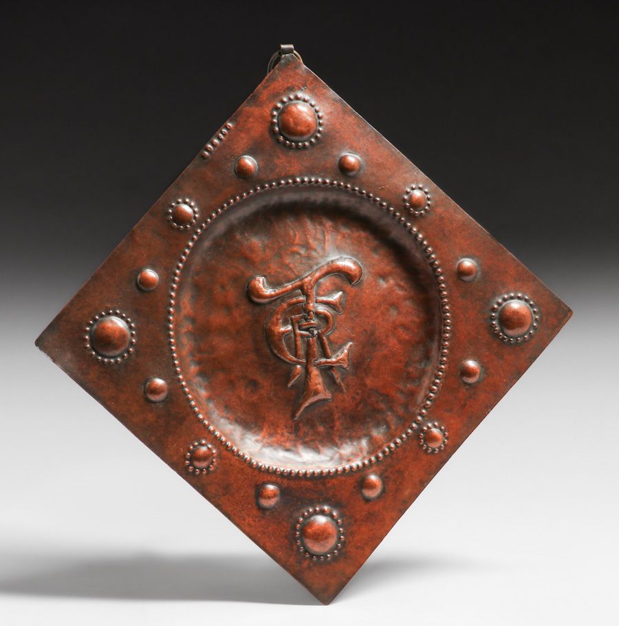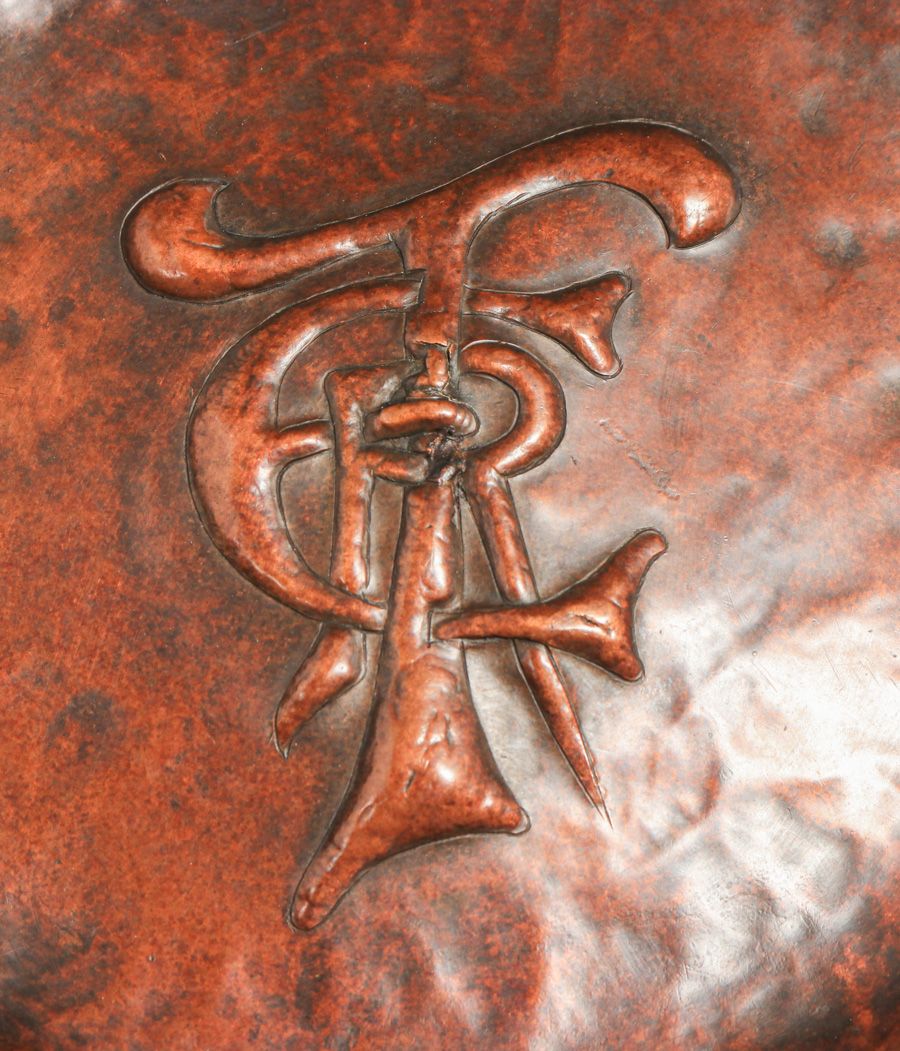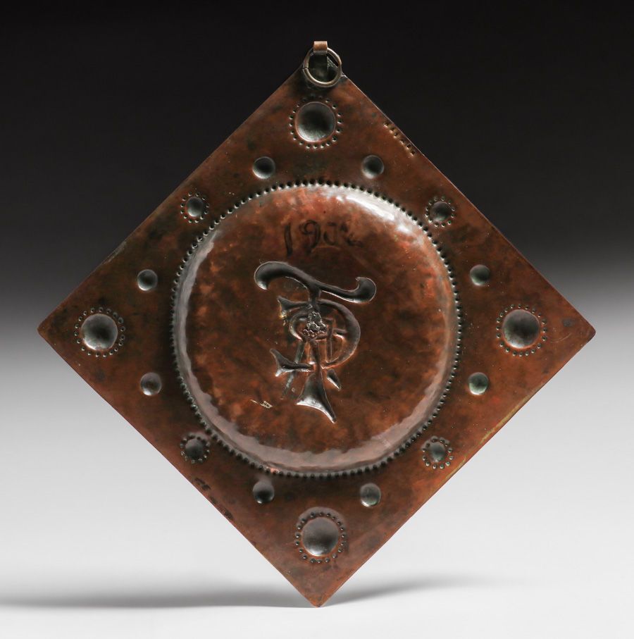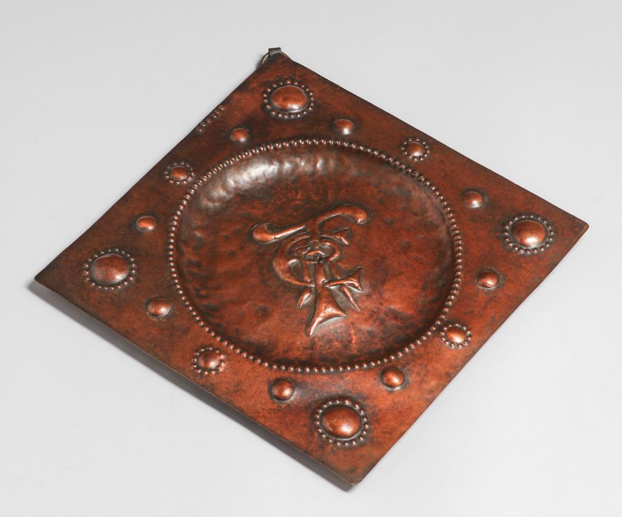 Newlyn Hammered Copper Repousse "ERT" Tray 1902. Signed. Excellent new patina. 9.75" x 9.75" $650