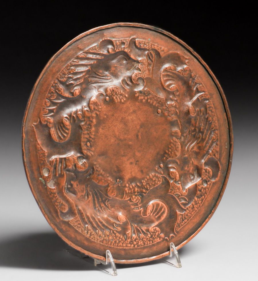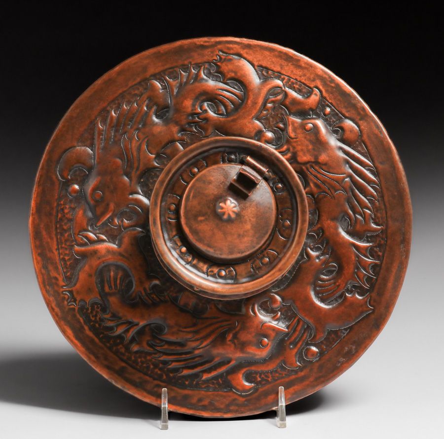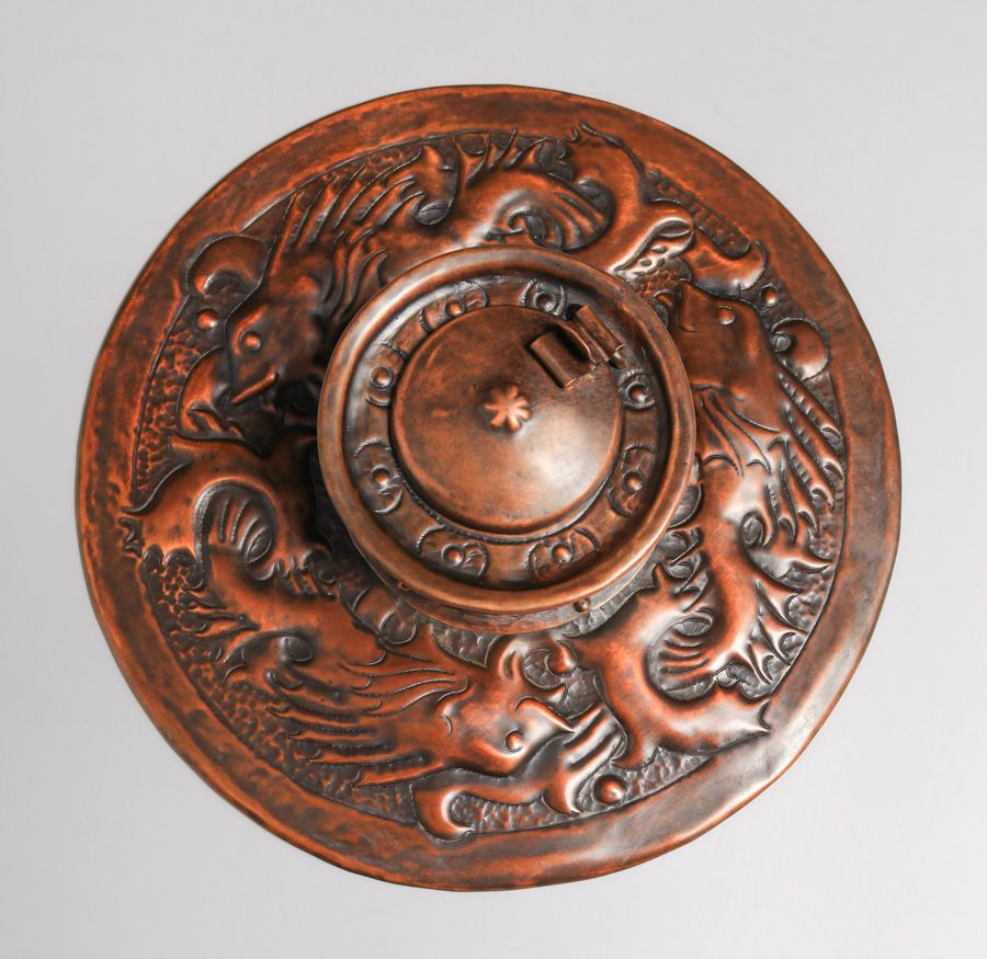 Newlyn Hammered Copper Repousse Fish Inkwell c1900s. Unsigned. Excellent new patina. 8.5"d x 2.75"h $650