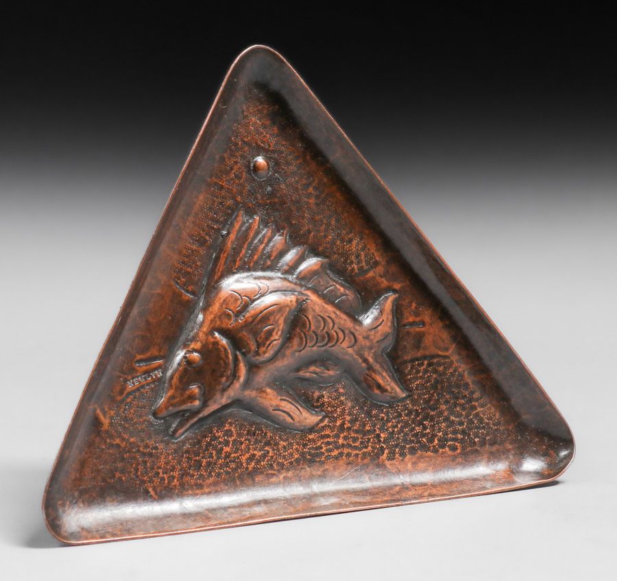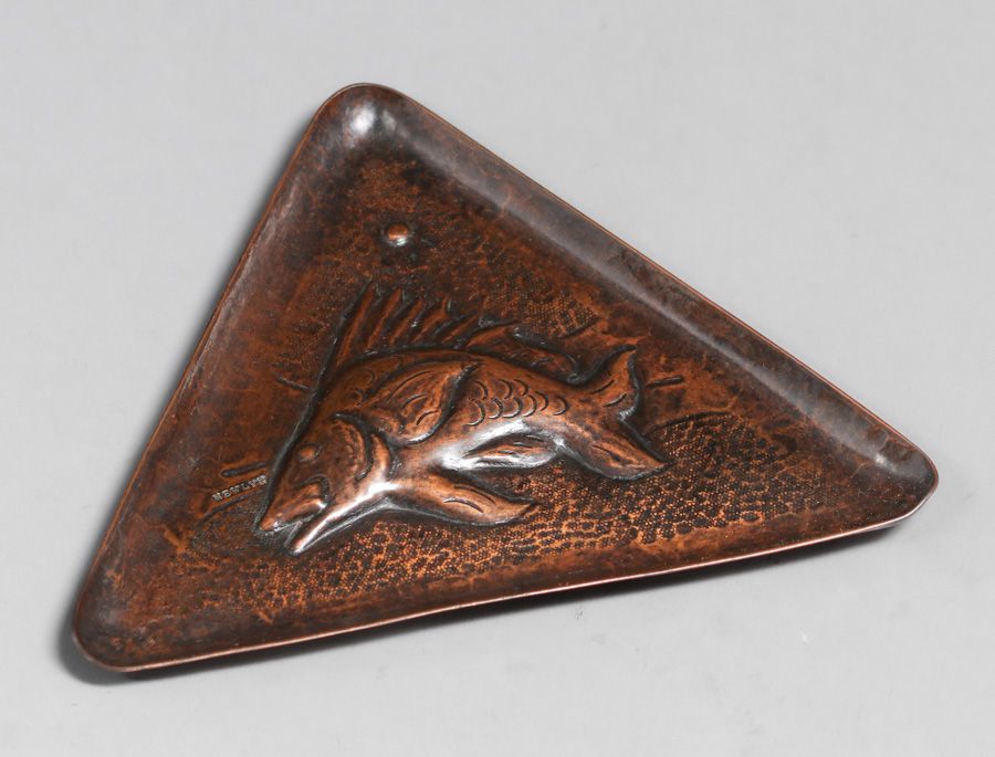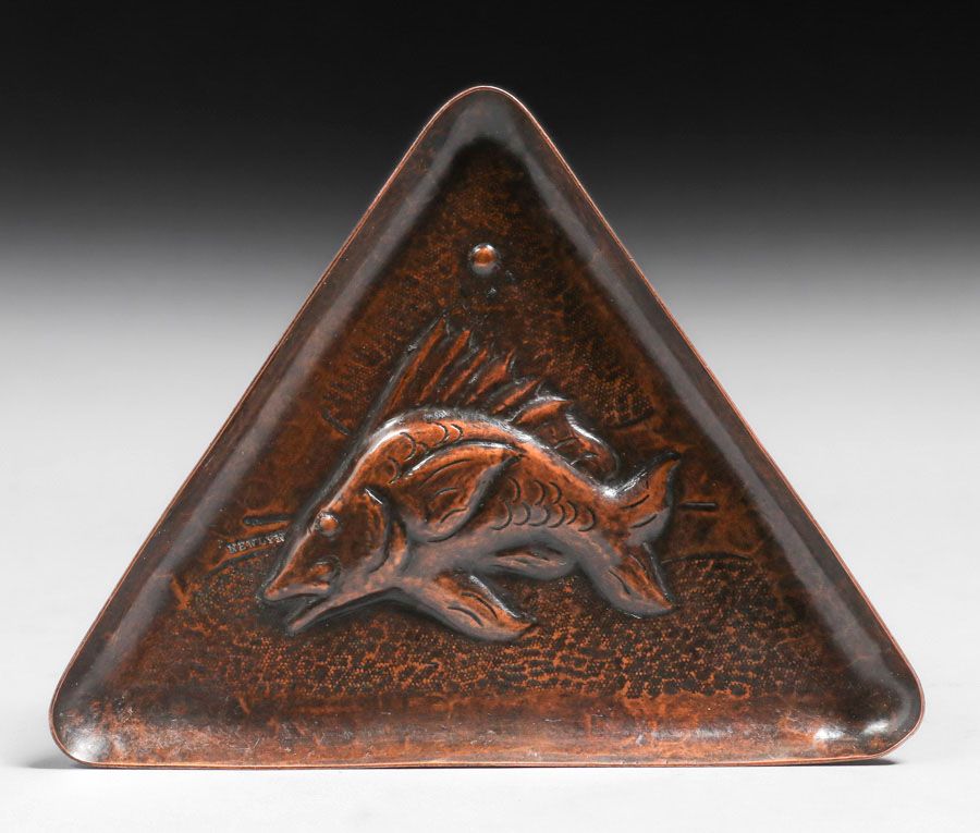 - Newlyn Hammered Copper Triangular Repousse Fish Tray c1900s