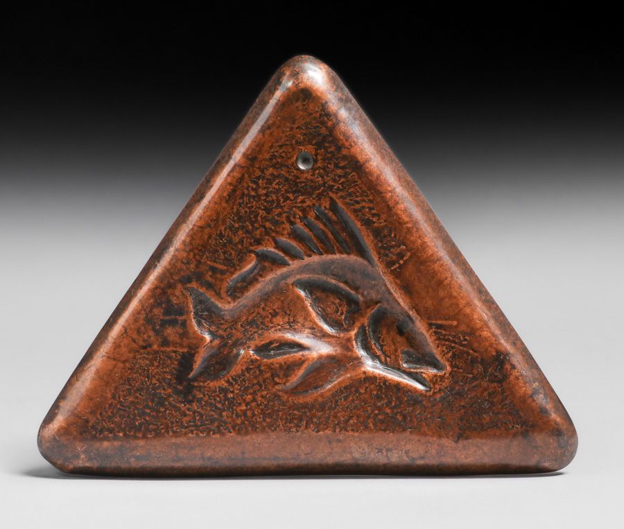 Newlyn Hammered Copper Triangular Repousse Fish Tray c1900s. Signed. Color added to original patina. 5" x 5" SOLD