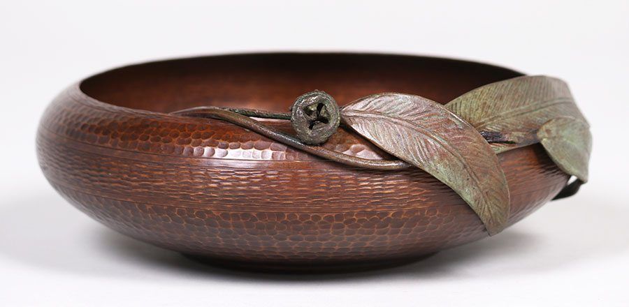 Old Mission Kopper Kraft hammered copper bowl with applied bronze eucalyptus leaves c1922-1925. Signed. Excellent new patina. 9"d x 3"h SOLD