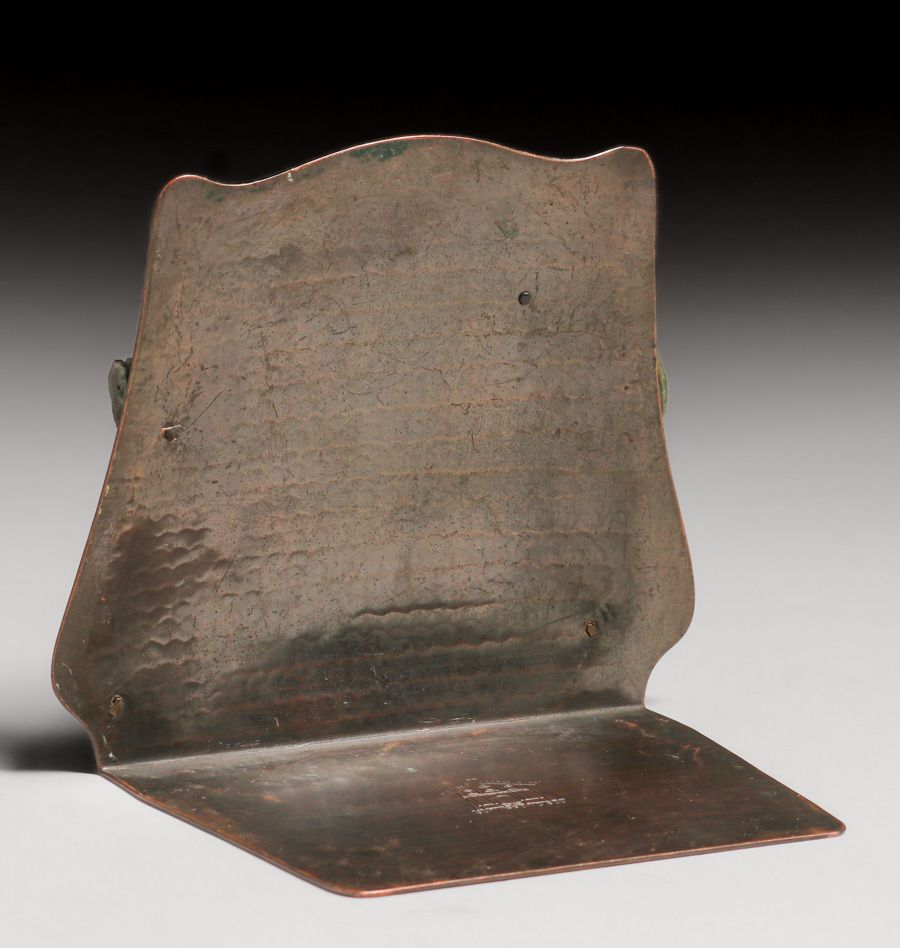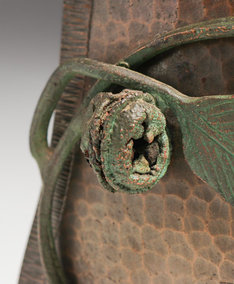 Old Mission Kopper Kraft – Fred Brosi San Francisco Hammered Copper Eucalyptus Bookends c1922-1925. Signed. Excellent original patina. 5.25"h x 6"w SOLD