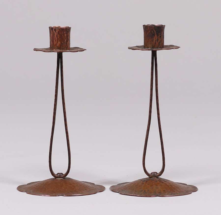 Old Mission Kopper Kraft hammered copper double-stem candlesticks c1922-1925. Unsigned. Original patina. 8"h x 4.25"d SOLD