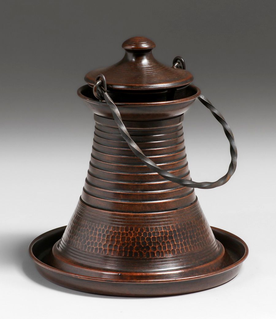 Old Mission Kopper Kraft Hammered Copper Fire Starter Bucket c1922-1925. Signed. Excellent new patina. Does not include fire starter poker. 12.5h with handle. 9h x 7.5d inches SOLD