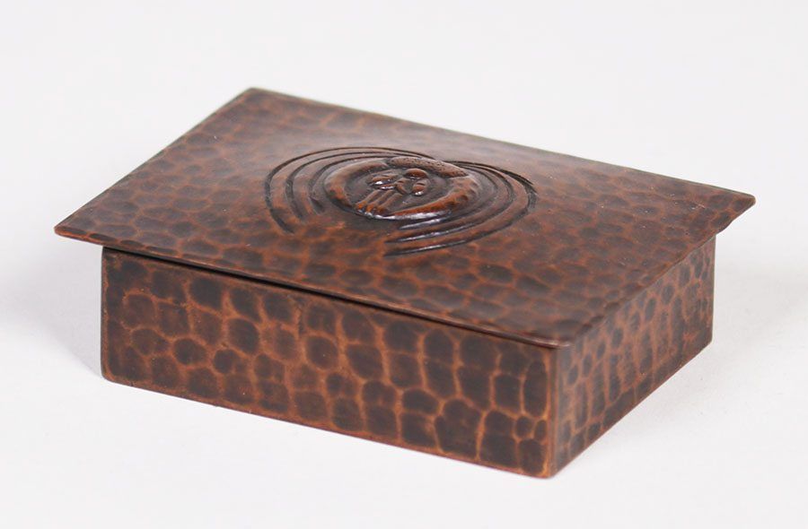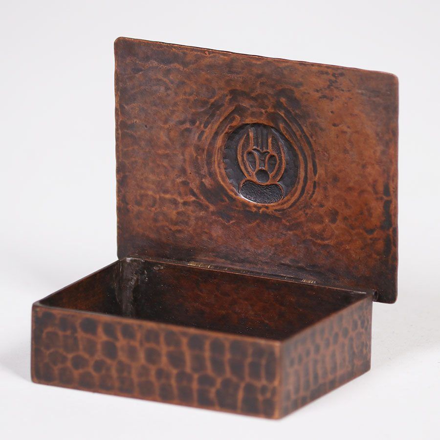 Old Mission Kopper Kraft stamp box c1922-1925. Signed. Excellent new patina. 3"w x 2.25"d x 1"h SOLD