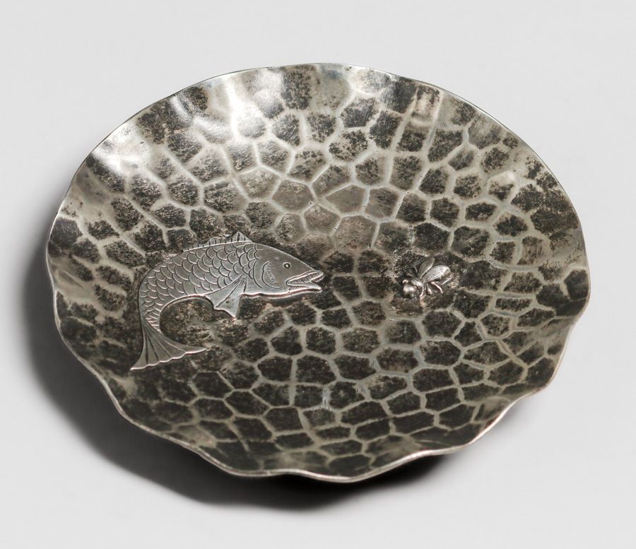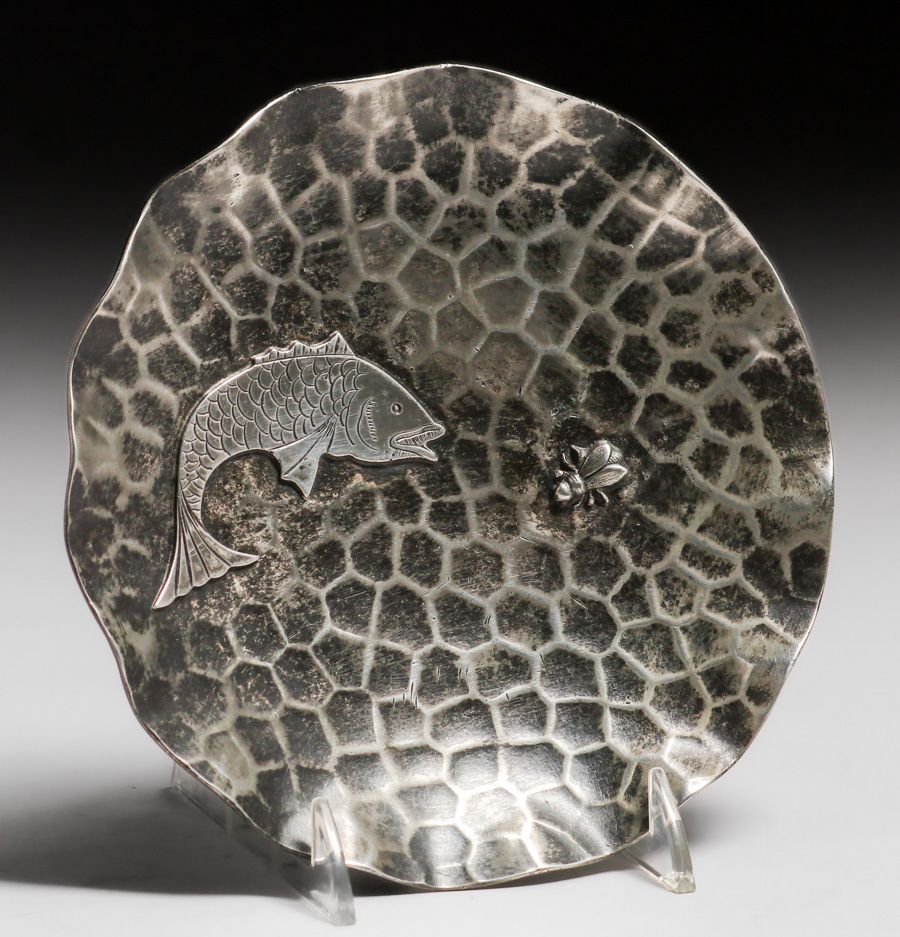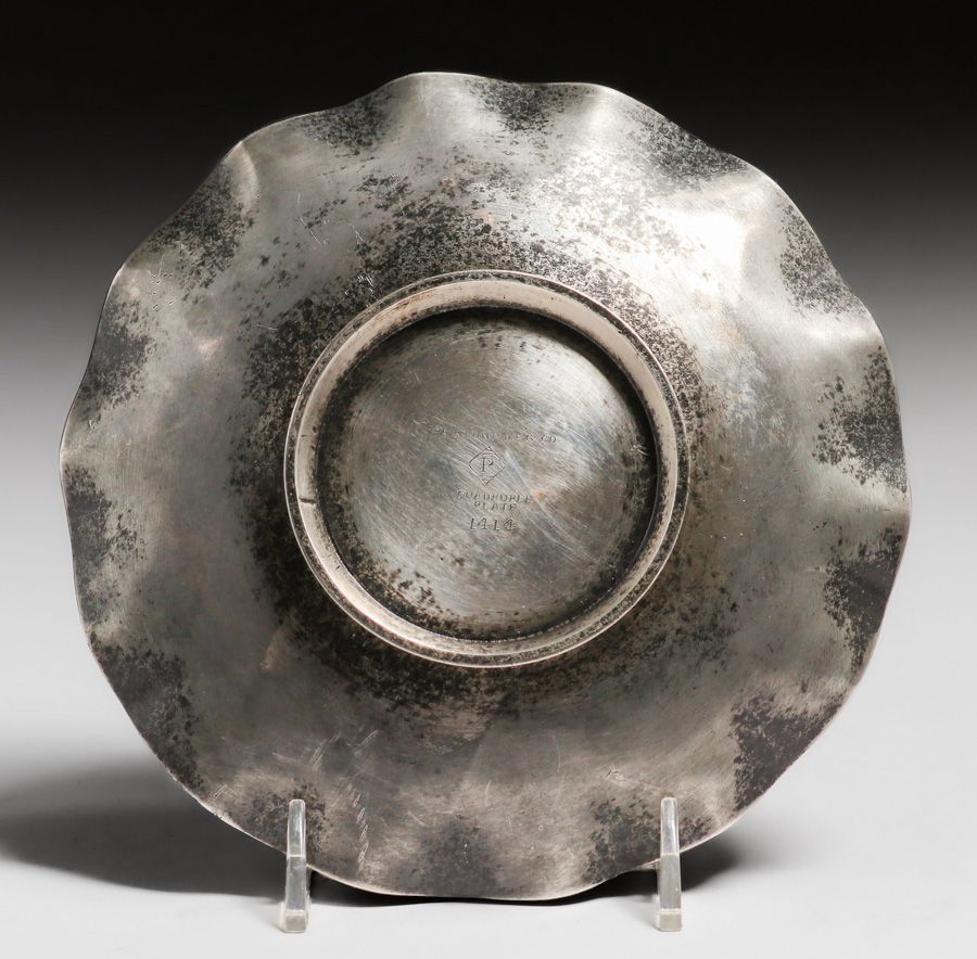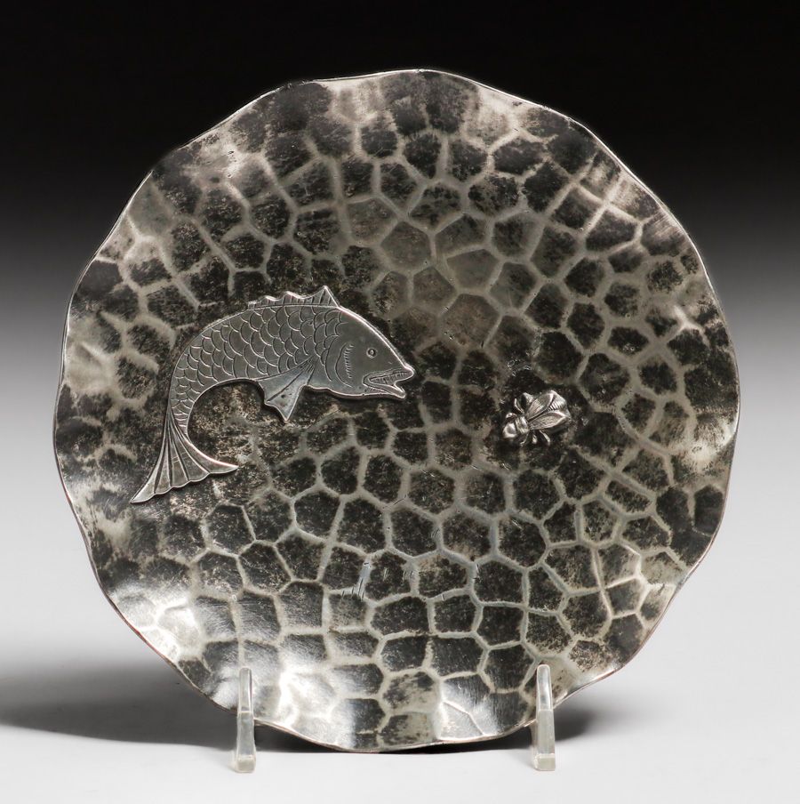 Pairpoint Aesthetic Movement Hammered Copper Silver-Plated Tray c1900. Signed. Excellent original patina. 6"d SOLD
