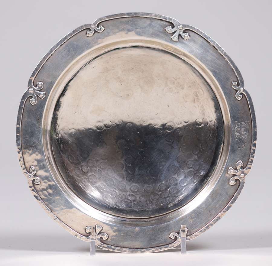 Robert Mills , Oakland, CA hammered sterling silver tray similar to Shreve & Co c1920s. Perfect condition. Mills was a partner in Mills & Burnley of Oakland, CA and previously worked for Shreve & Co in San Francisco. 7"d SOLD