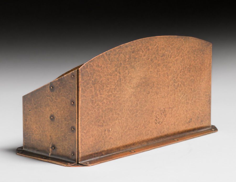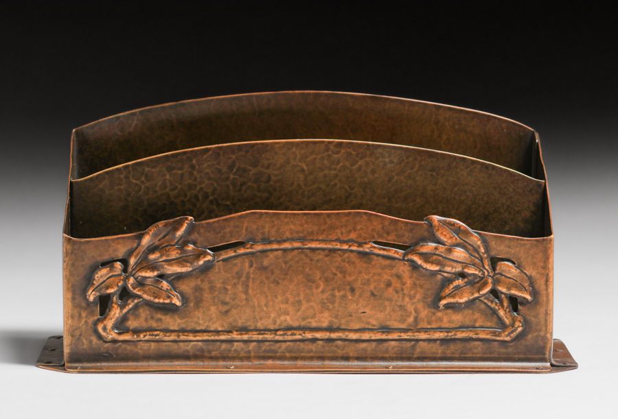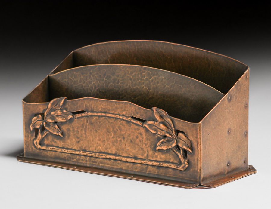 Rokesley Shop - Cleveland, Ohio Cutout Hammered Brass Letter Rack c1910. Signed. Excellent new patina. 10 3/8"w x 4 5/8"d x 5 1/8"h SOLD