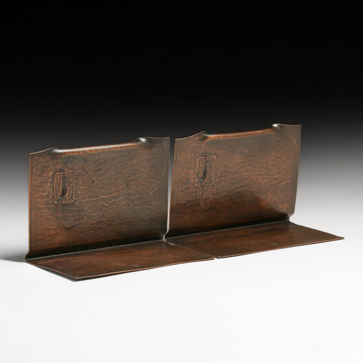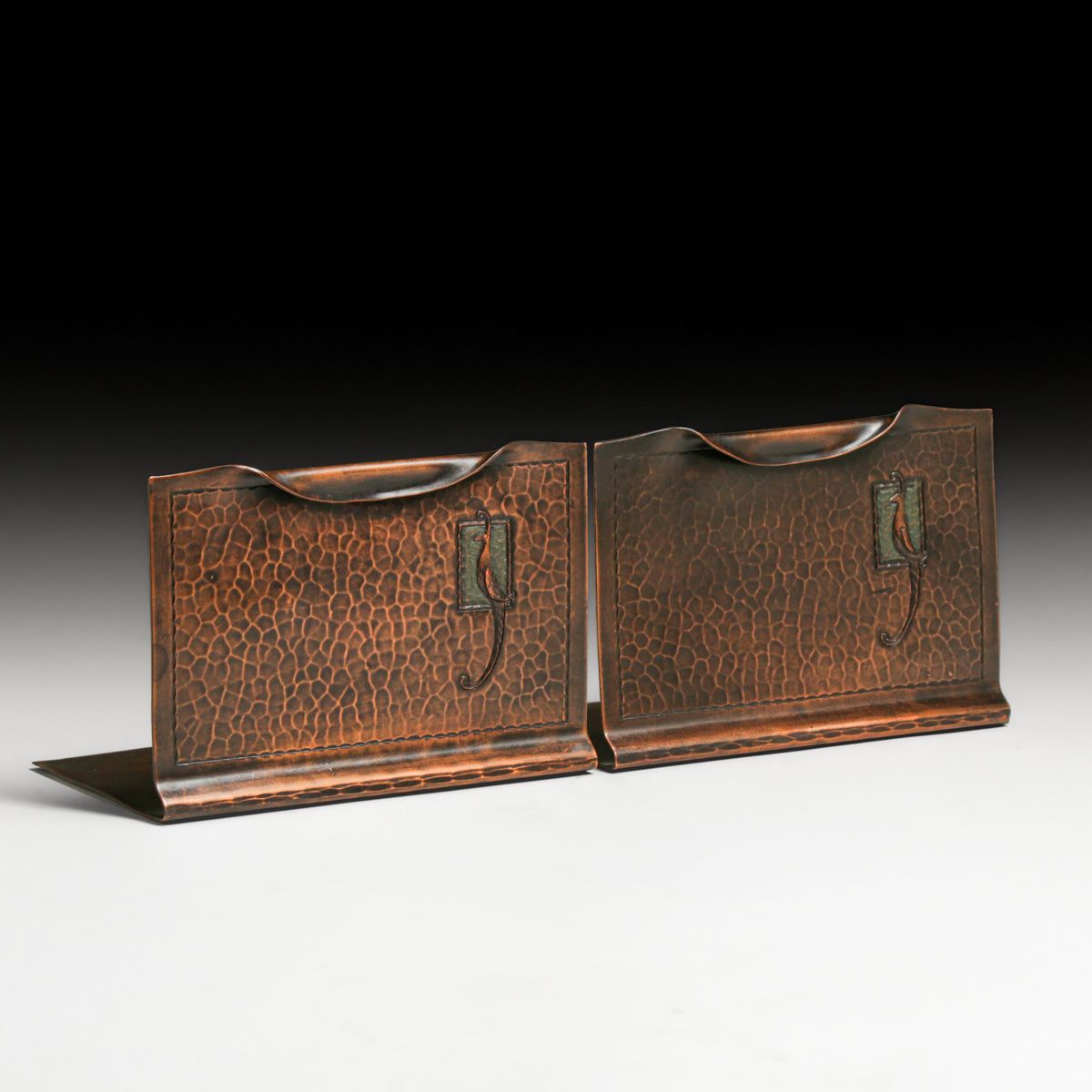 Roycroft Hammered Copper Bird-of-Paradise Bookends c1915. Signed with earlier mark. Excellent new patina. 6″w x 4″h