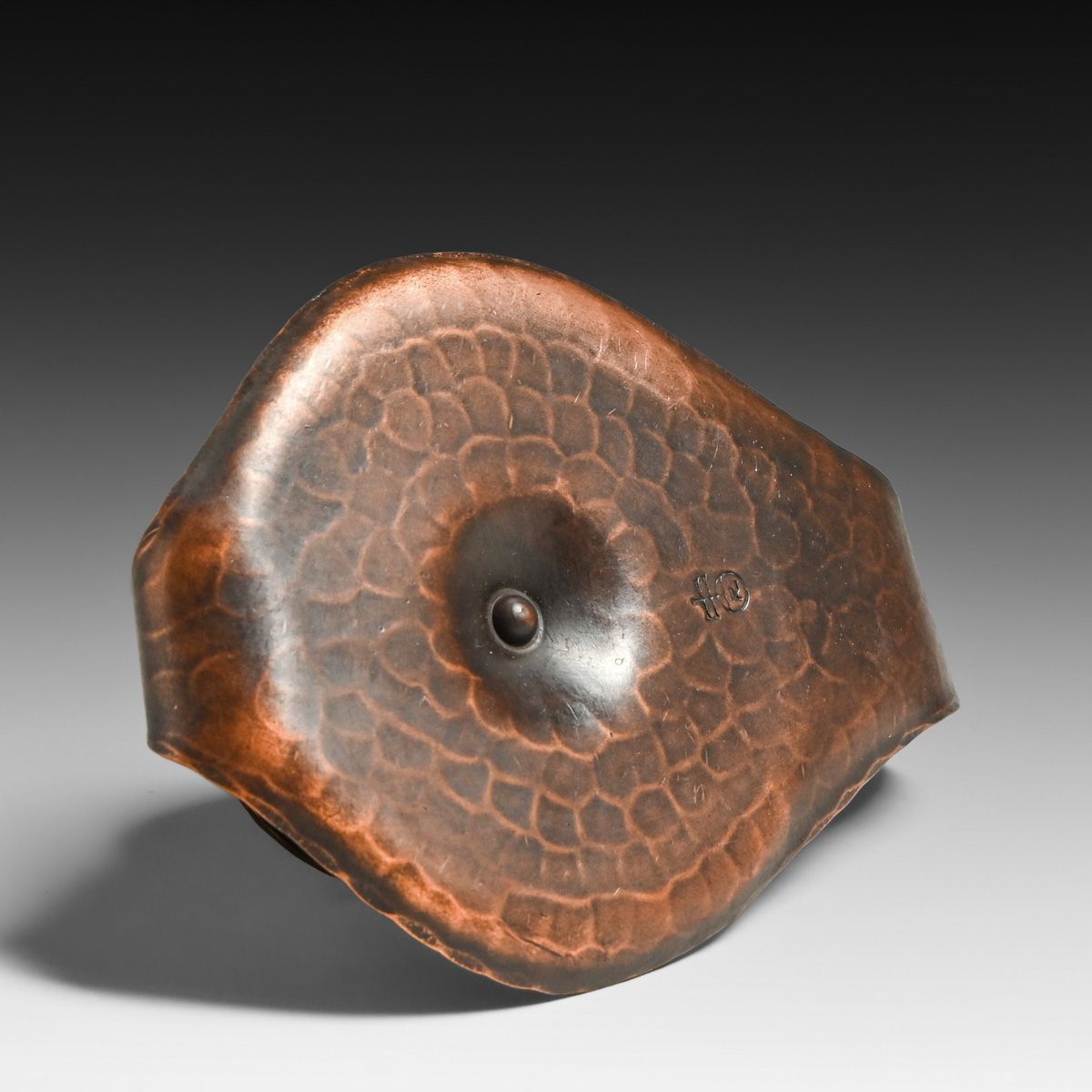Roycroft Hammered Copper One-Handle Candlestick c1920s. Signed. Excellent new patina. 4.75" x 3.25"w x 1.5"h