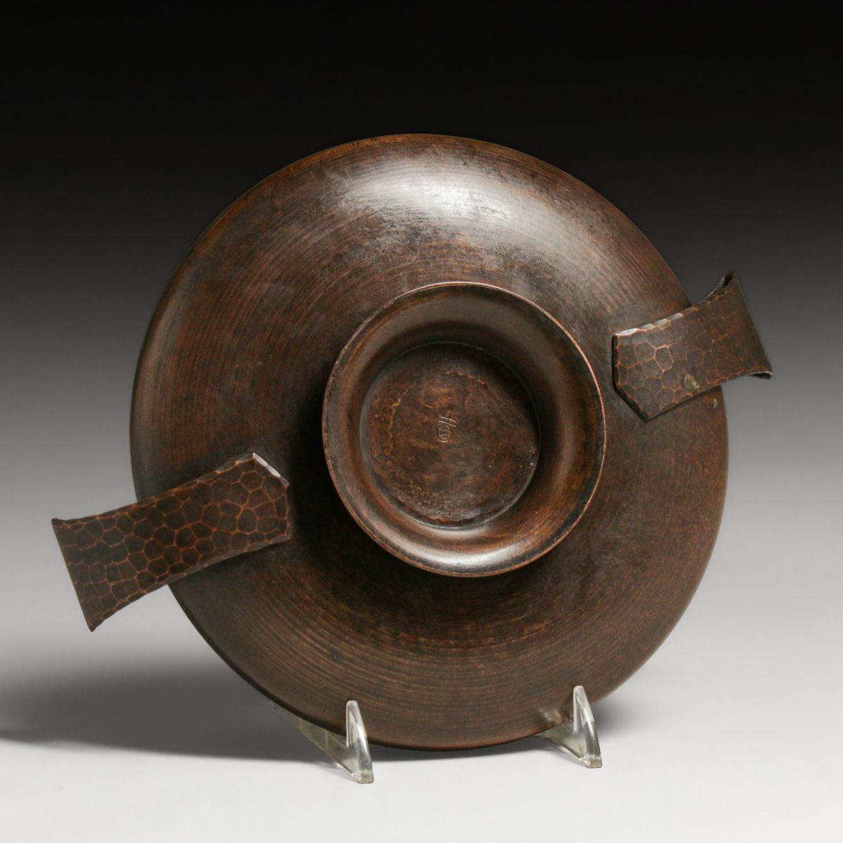 Roycroft Hammered Copper Two-Handled Bowl c1920s. Signed. Excellent new patina. 8.5″w x 7″d x 2″h