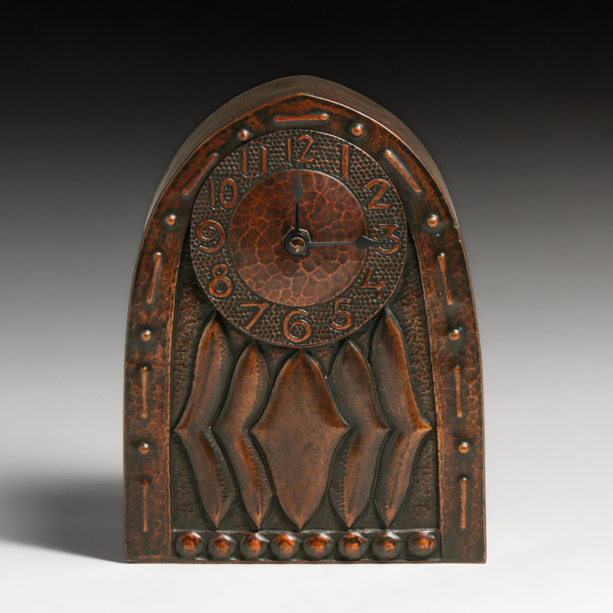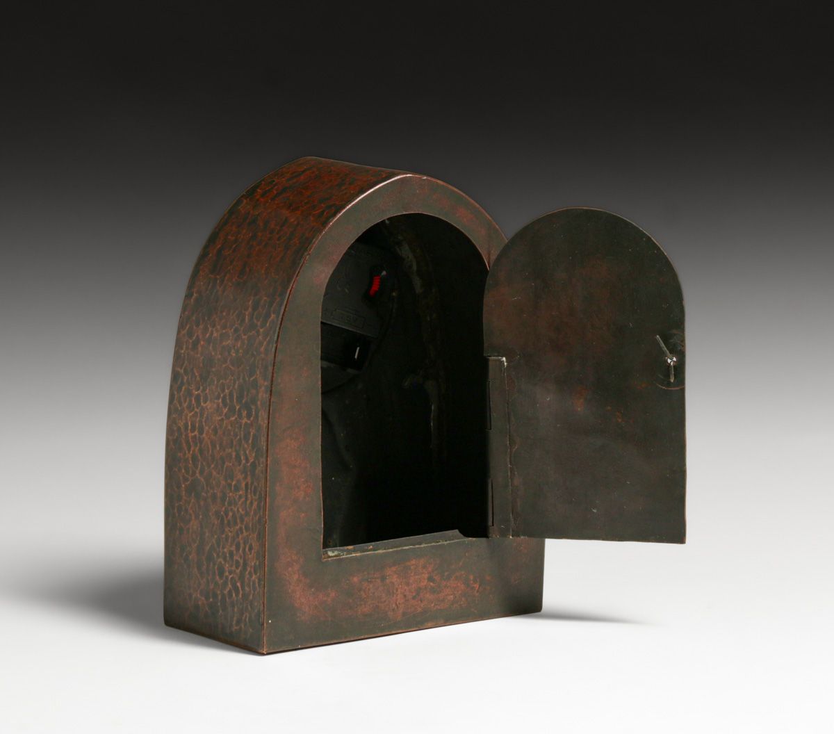 Austrian Secessionist Hammered Copper Clock c1905. Unsigned. Replaced battery powered mechanism. Excellent new patina. 7.5”h x 5.75”w x 2.75”d