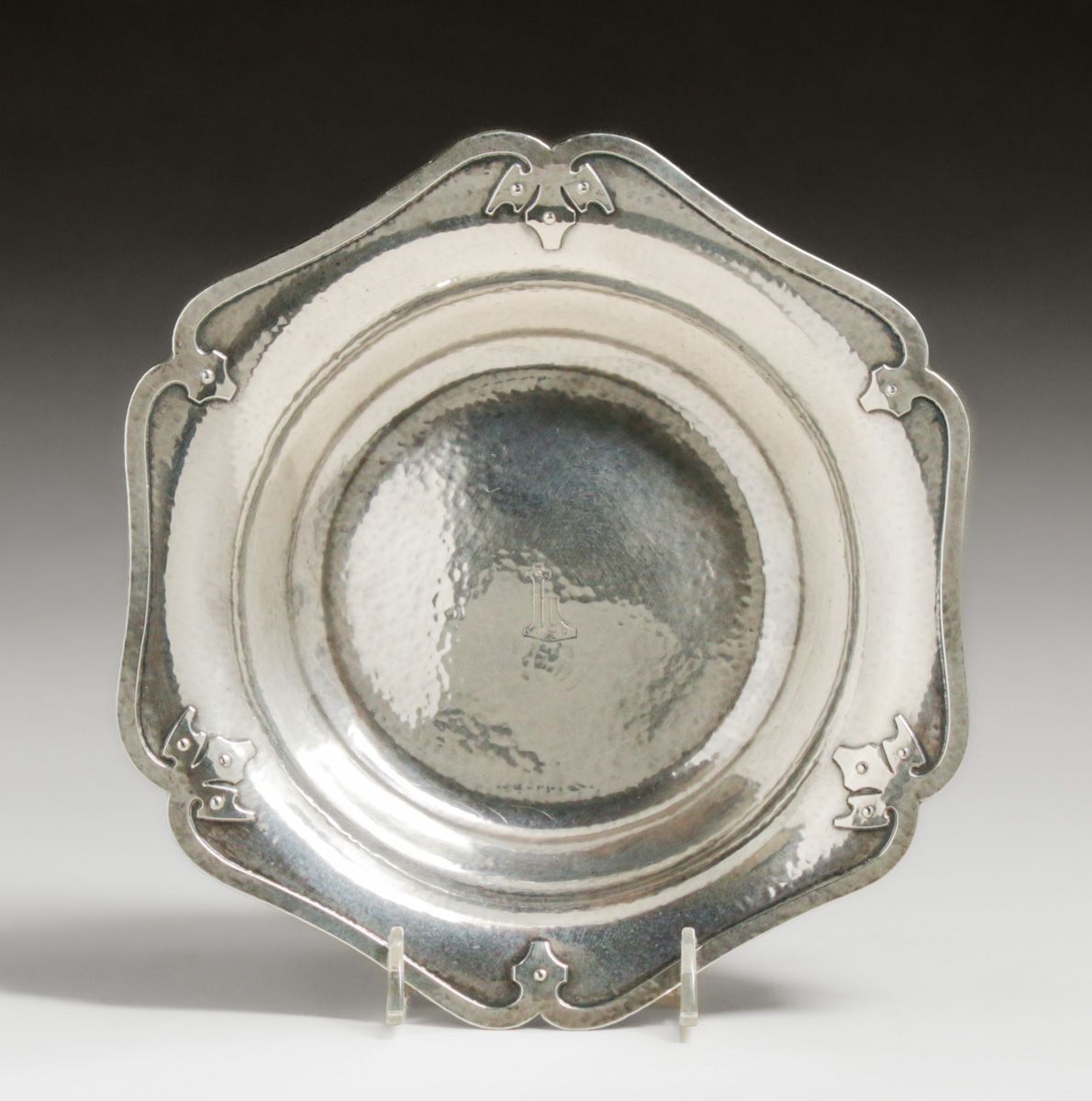 Shreve & Co - San Francisco "14th Century" Hand Hammered Sterling Silver Tray c1910. Signed. Excellent condition. 8"d