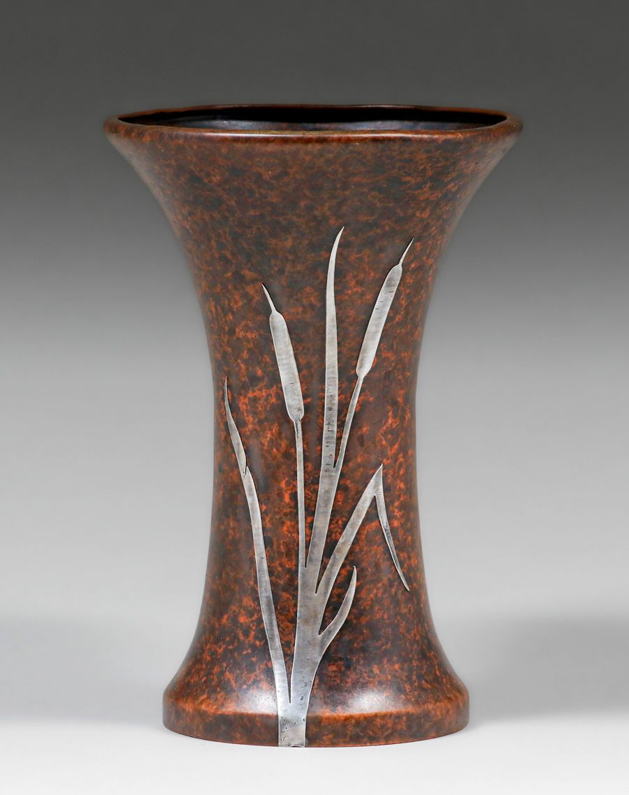 - Silvercrest Sterling on Bronze #A7017 Cattail Overlay Vase c1920