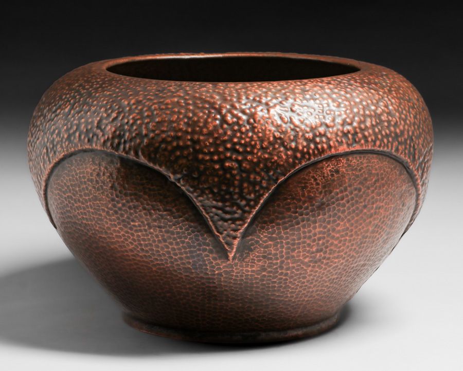 Turchin Co , New York H ammered Copper Warty Jardiniere c1910. Signed. Excellent new patina. 15″d x 10″h SOLD