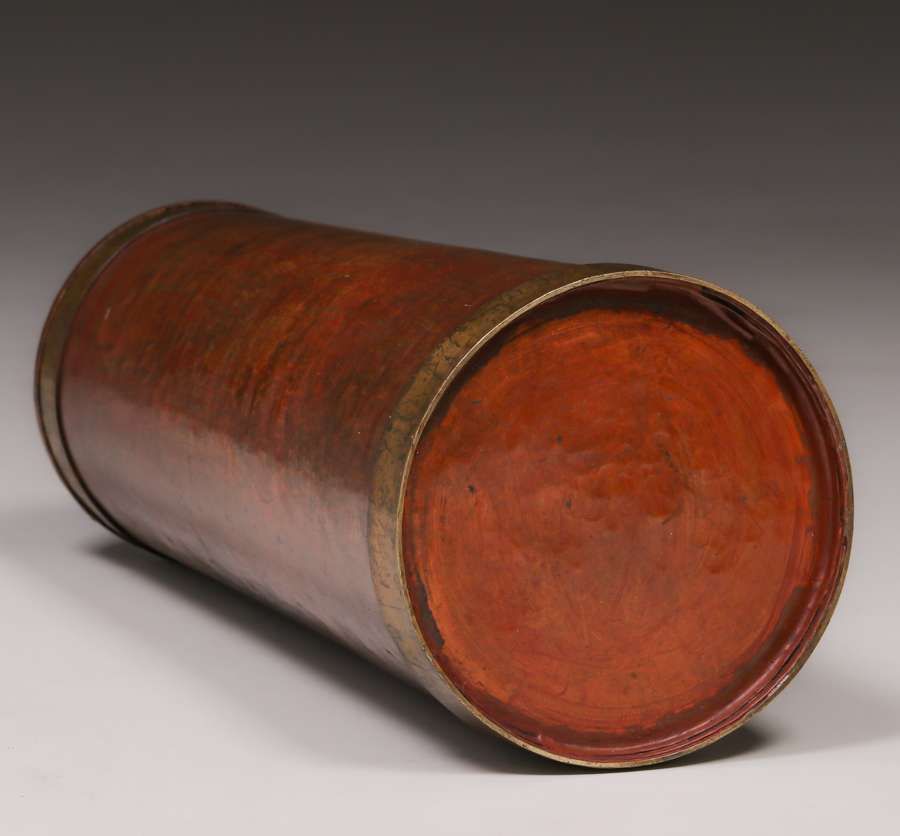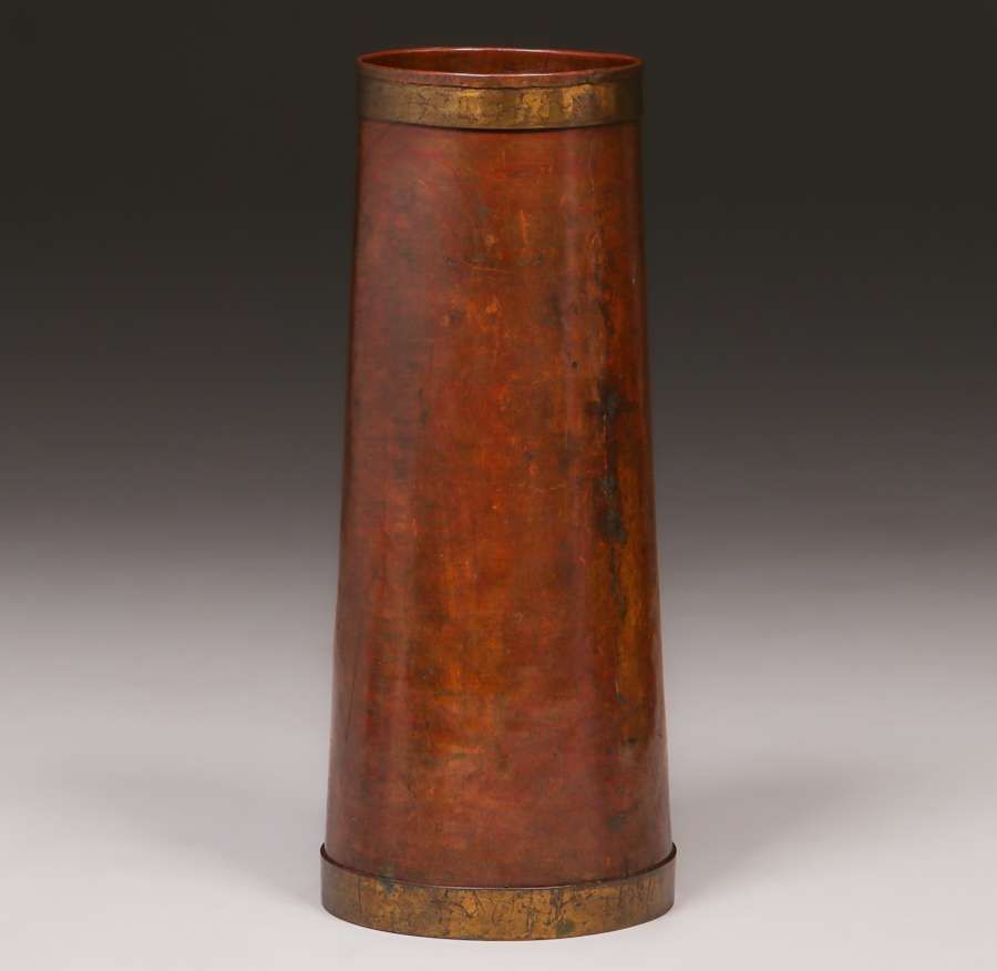 Thomas McGlynn Hammered Copper & Brass Vase c1912. Unsigned. Provenance: McGlynn Family. Excellent original patina. McGlynn was an artist in San Francisco, worked as chief draftsman for Arthur Mathews' Furniture Shop and was a designer for Dirk van Erp. He became quite competent as a metal smith but never pursued the craft. McGlynn is credited for having designed the oak tree cutout motif occasionally seen on van Erp pieces. 14"h x 5.75"d $3800