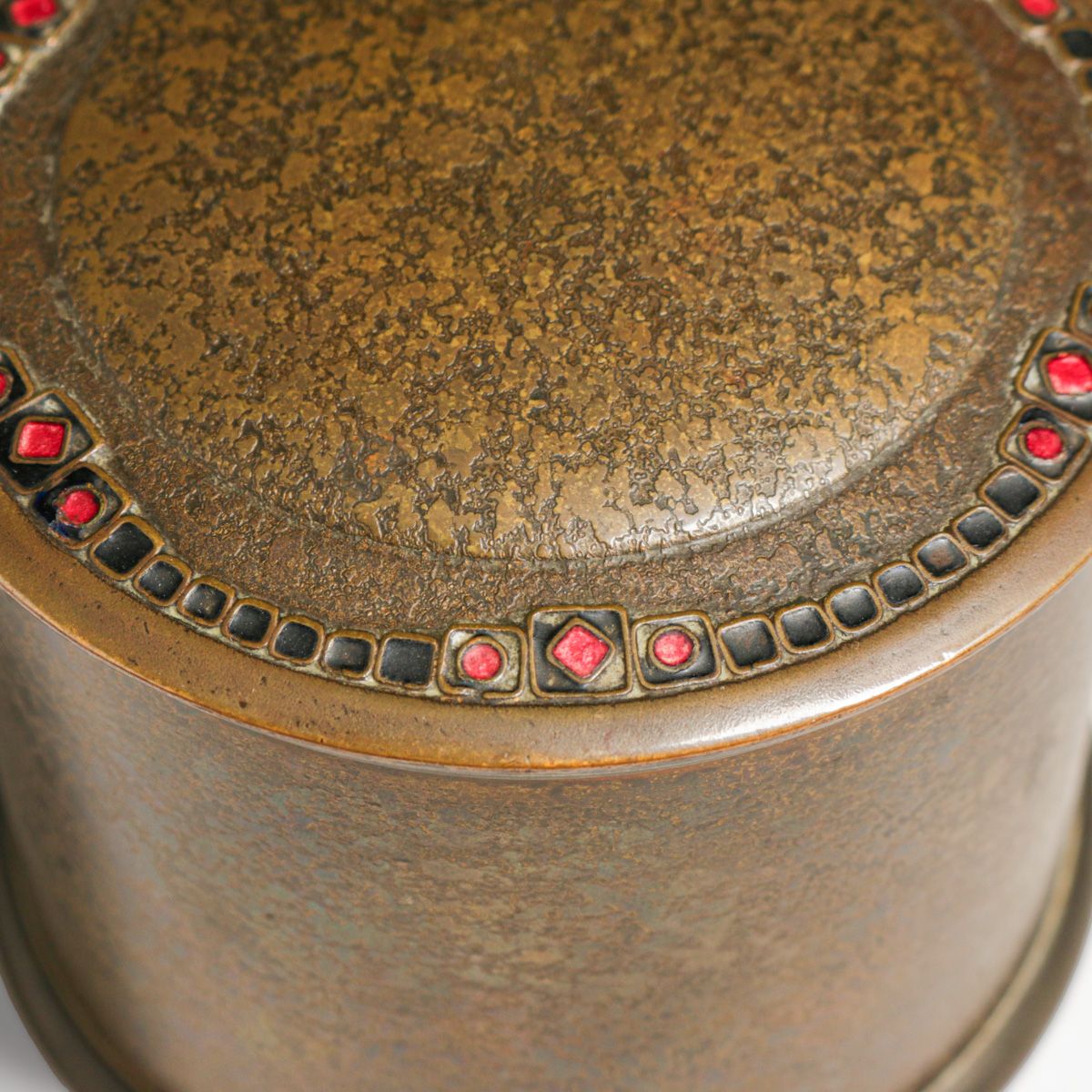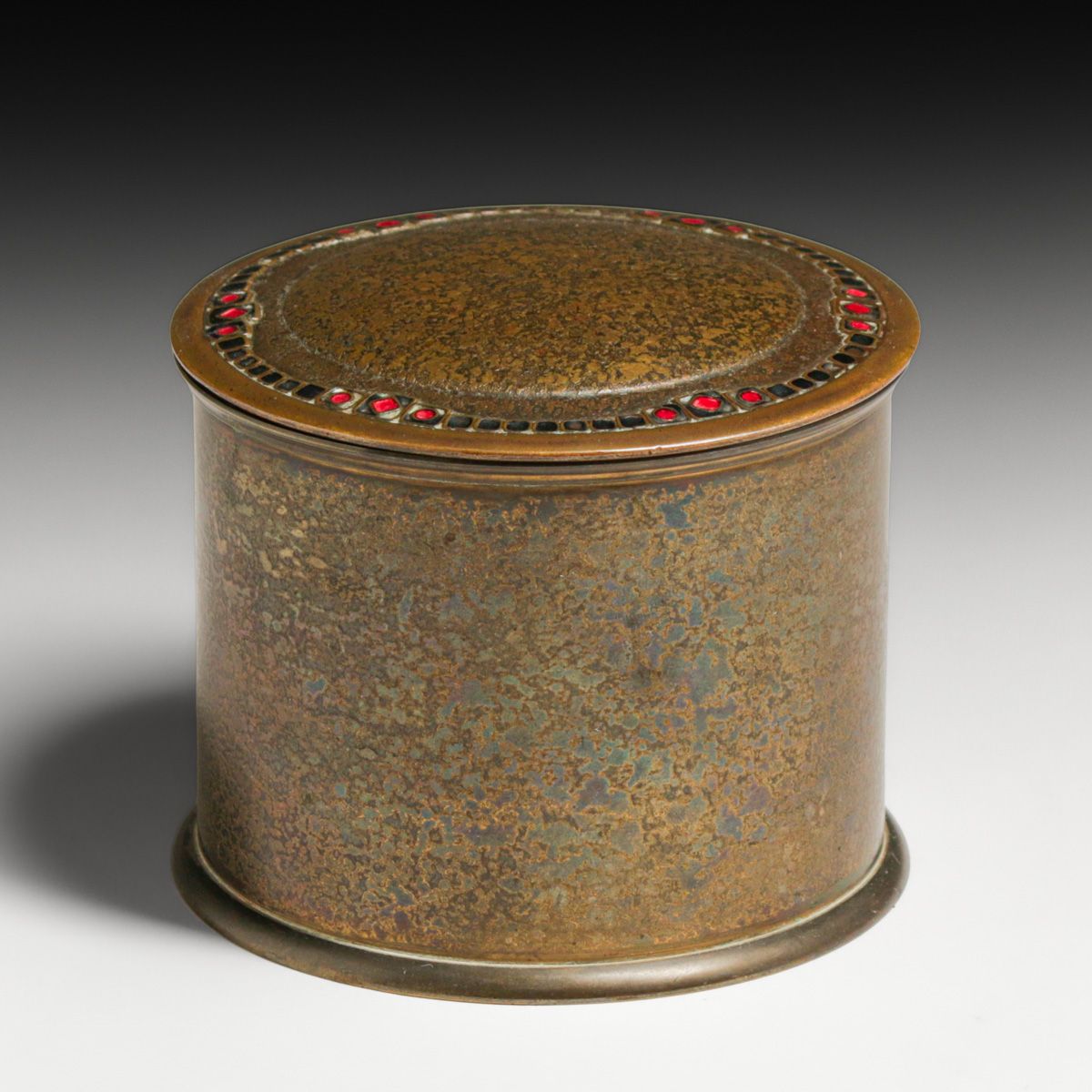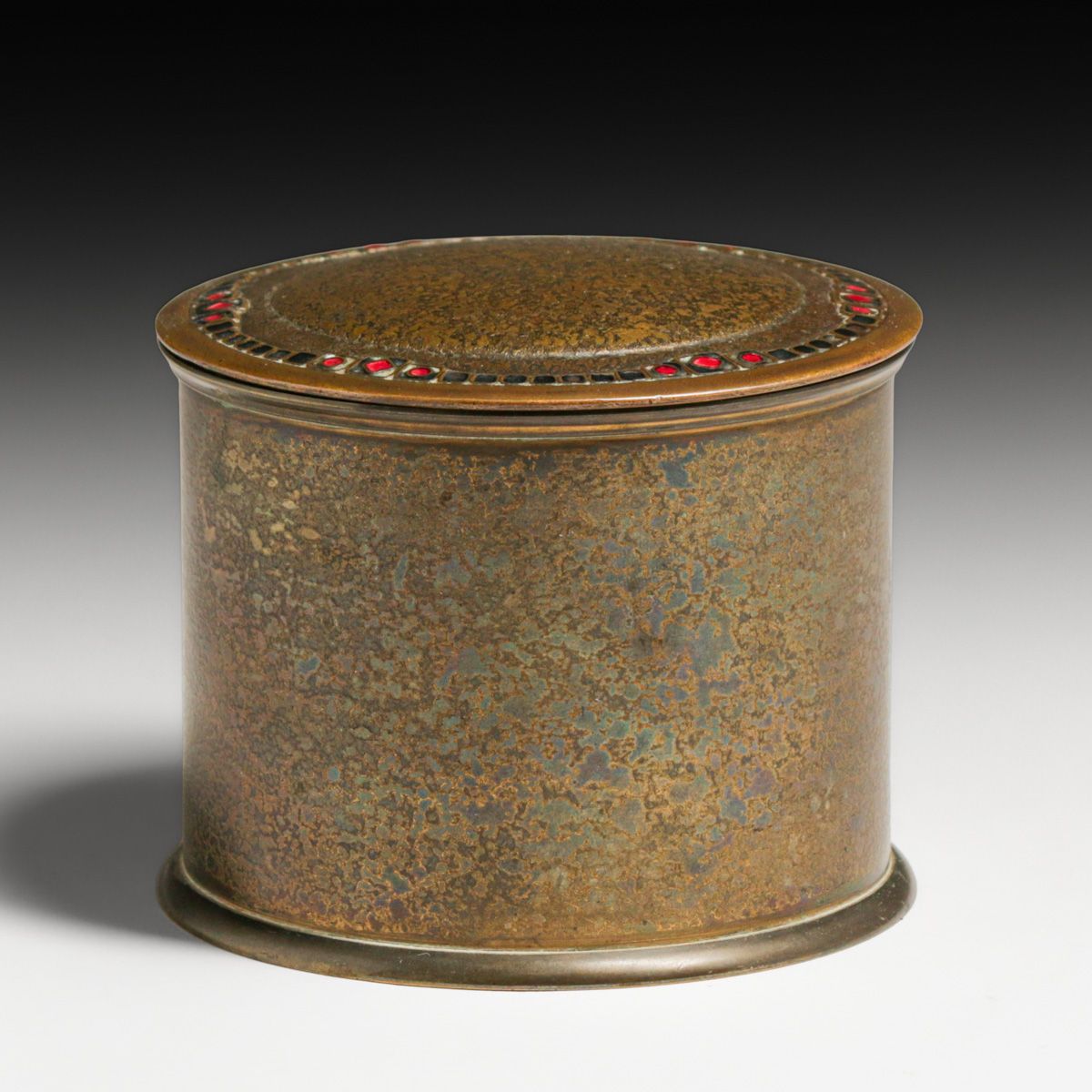Tiffany Furnaces Bronze & Enamel Covered Box c1920s. Signed. Excellent original patina. 4.25"d x 3.25"h