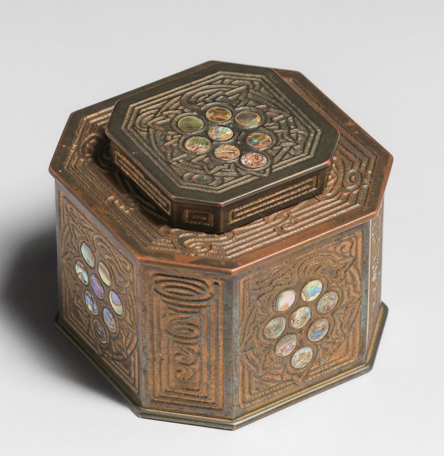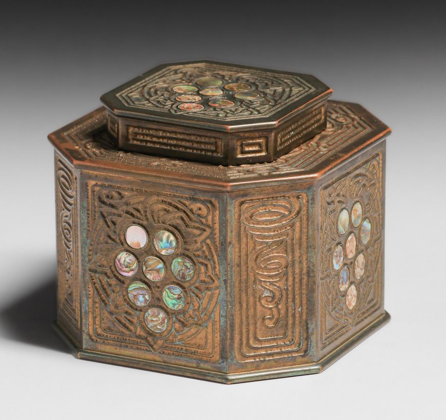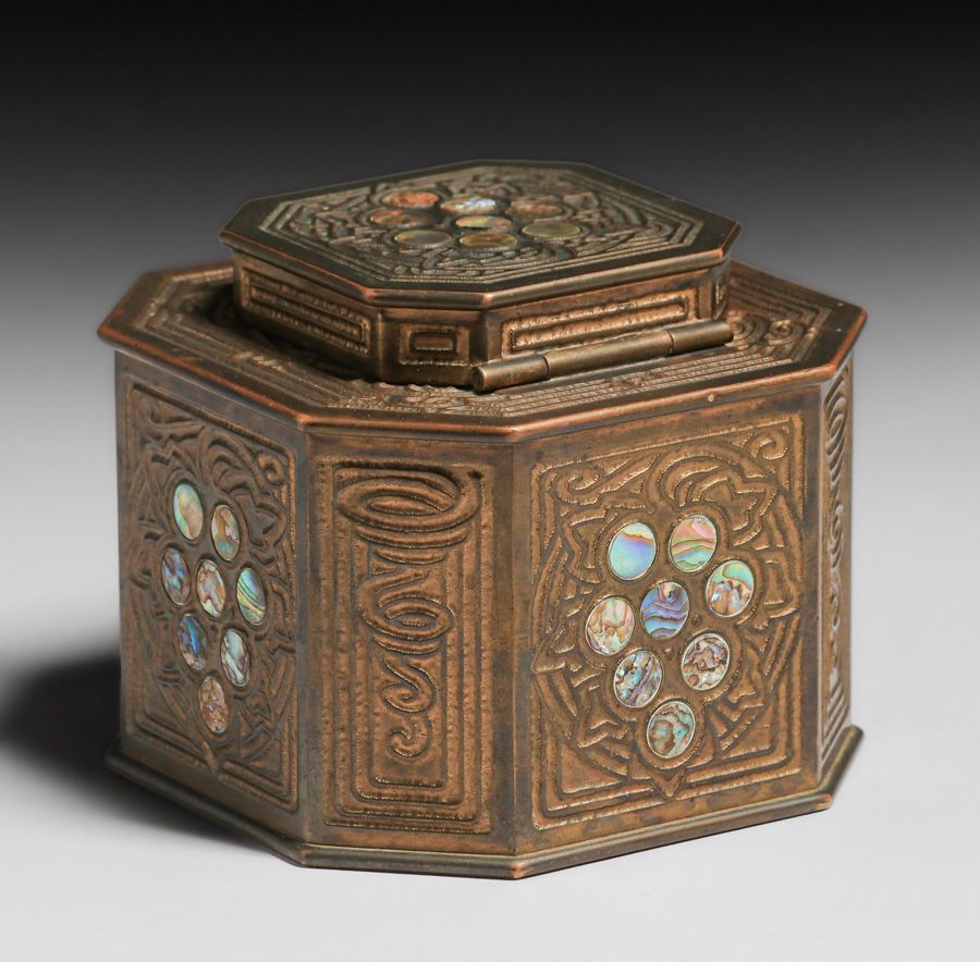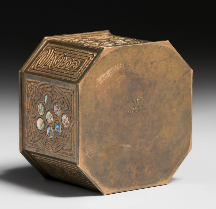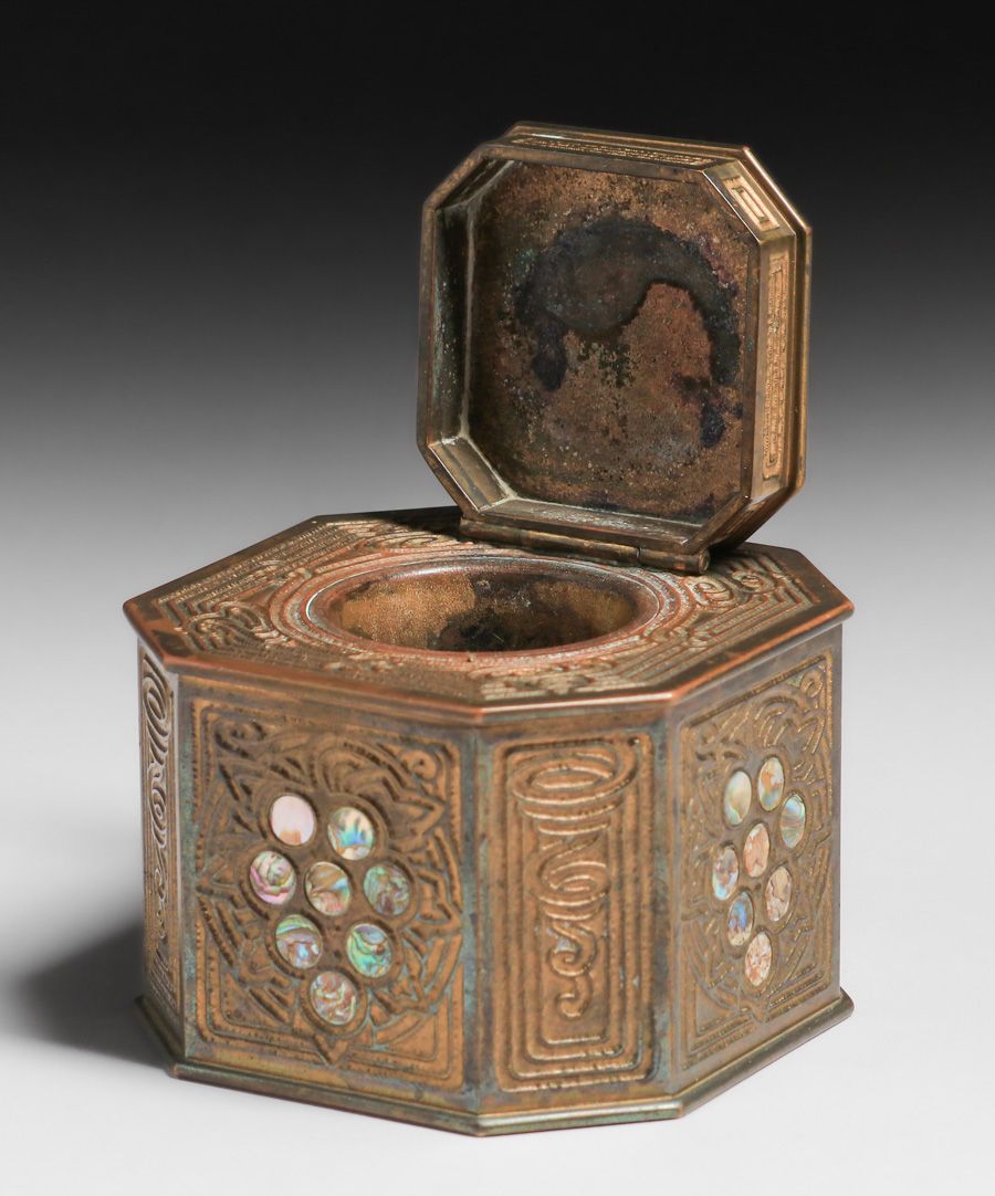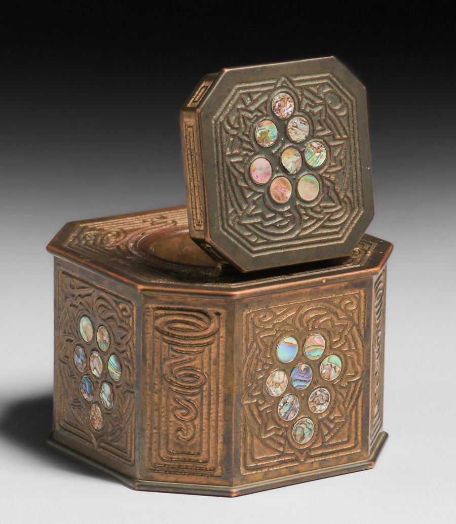 Tiffany Studios #1157 Bronze Dore Abalone Inkwell c1910. Signed. Excellent original patina. 4" x 4" x 3"h SOLD