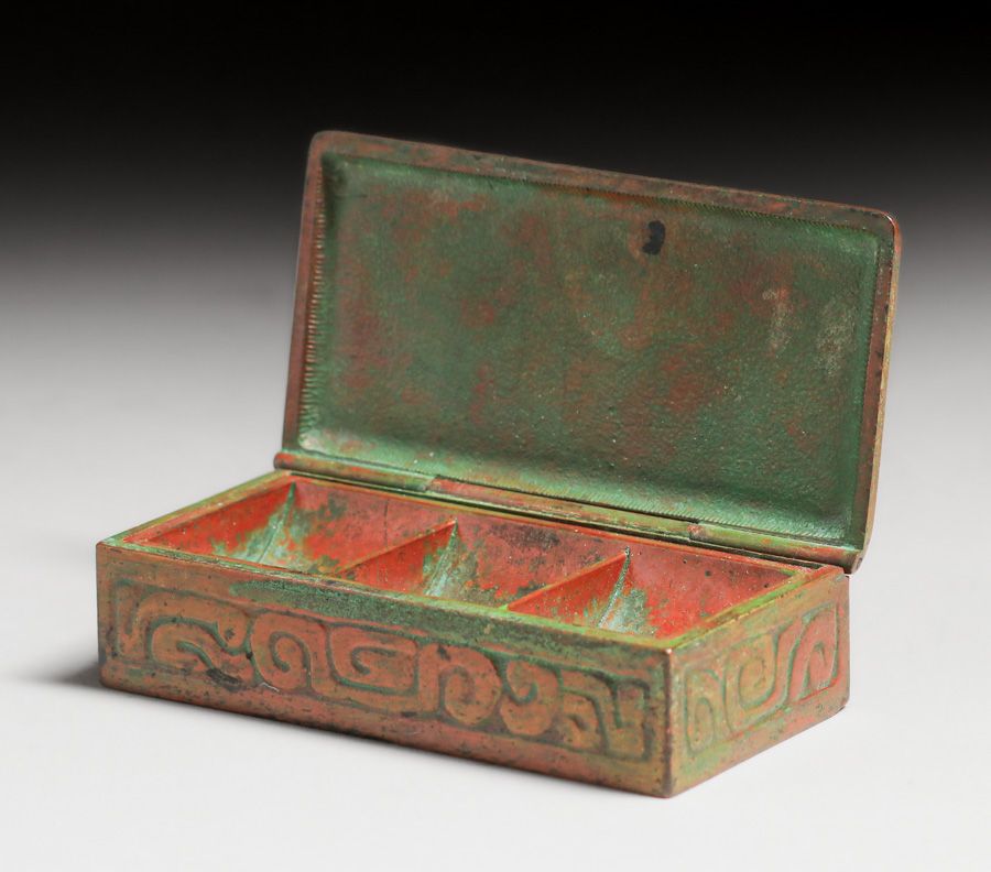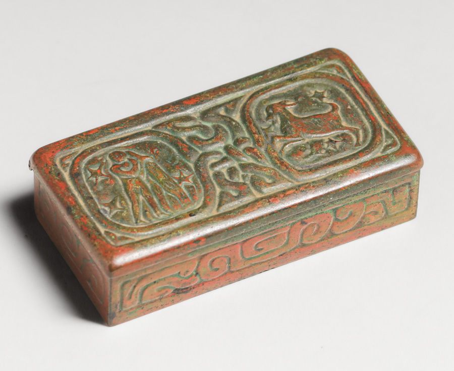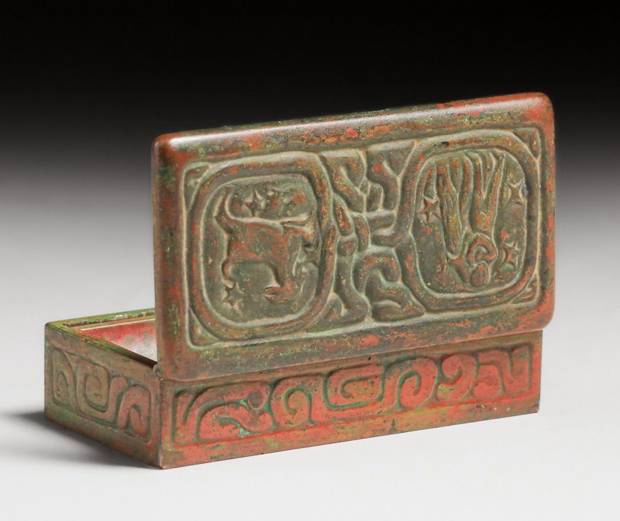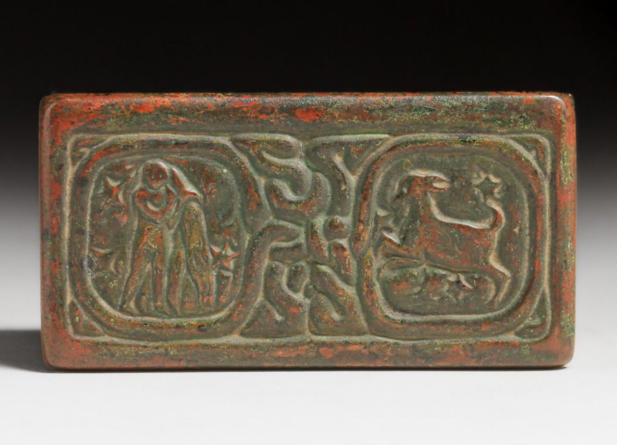 - Tiffany Studios #802 Bronze Zodiac Stamp Box c1910