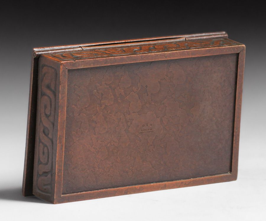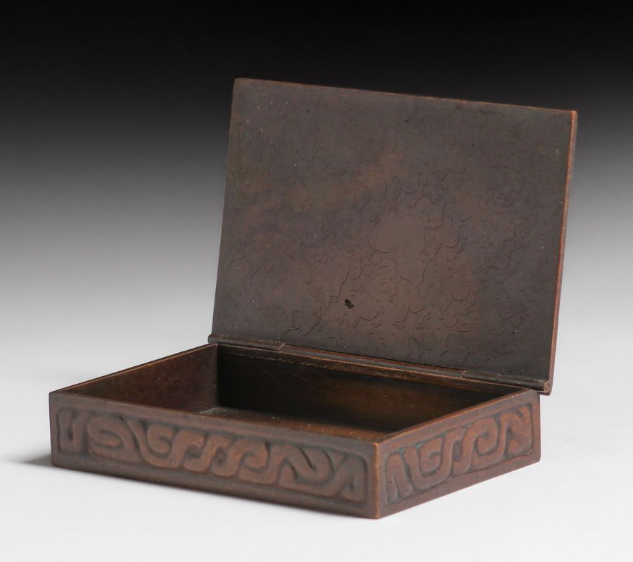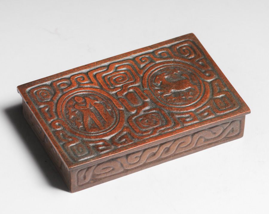 Tiffany Studios #810 Zodiac Box c1910. Signed. Color added to original patina. 5 3/8" x 3.5" x 1"h SOLD