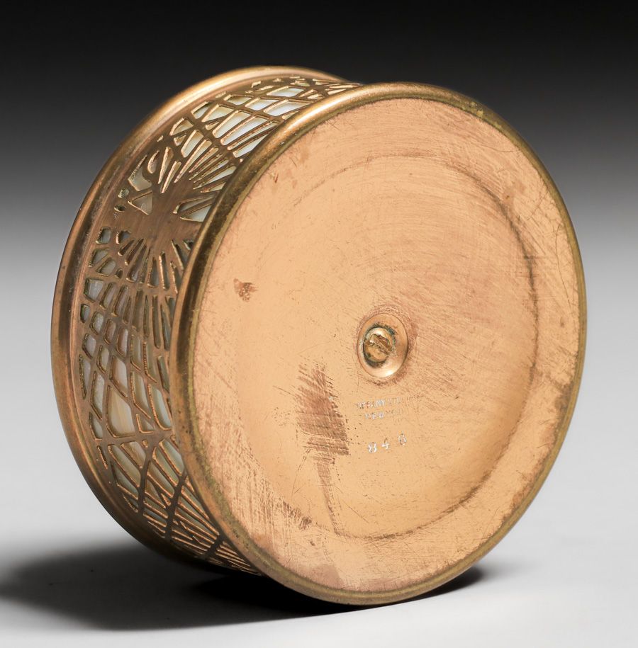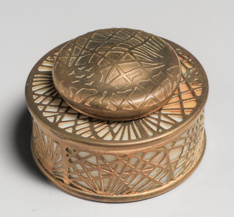 Tiffany Studios #846 Pine Needle Inkwell c1910s. Signed. Excellent original patina. Original glass in perfect condition. 3.75"d x 2"h SOLD
