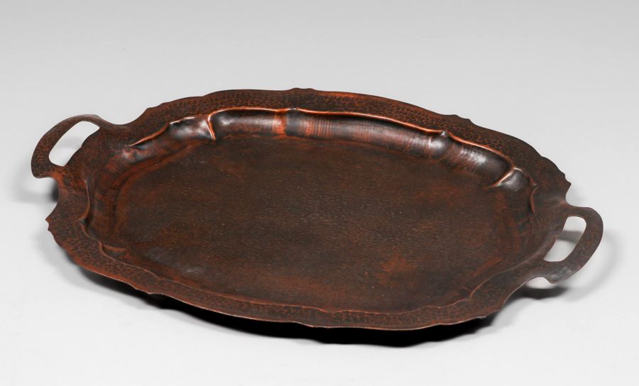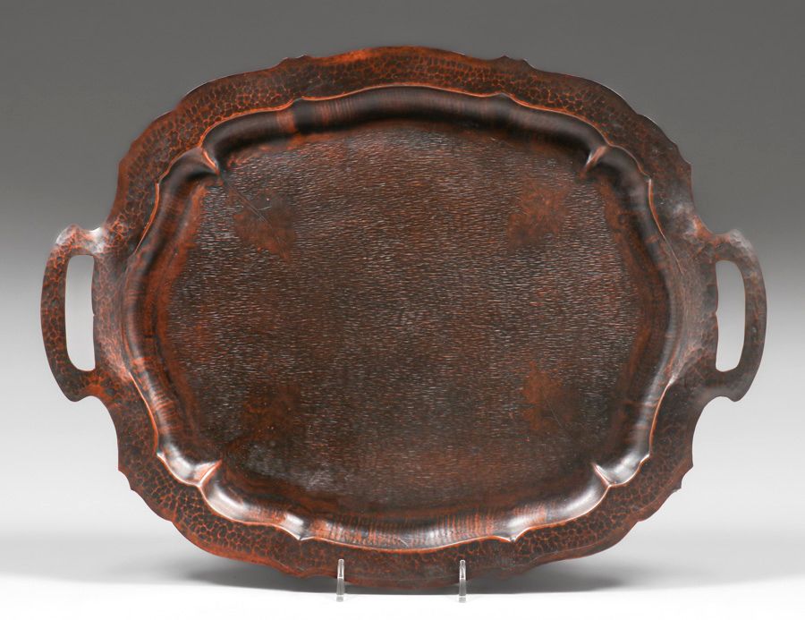 - William H. Pohlmann (1872-1938) Hammered Copper Two-Handled Grapeleaf Radial Sillouette Tray c1905