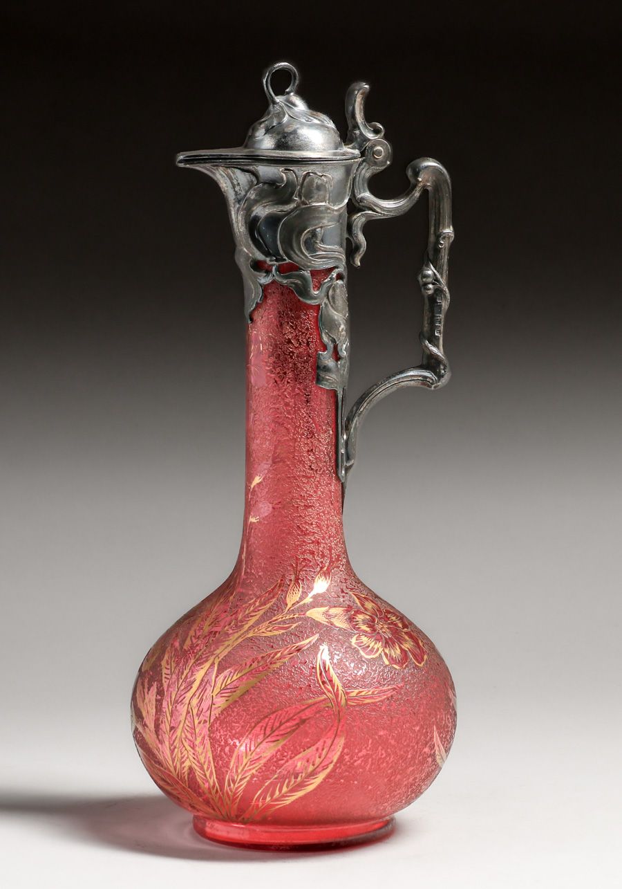 WMF - German Art Nouveau Silver-Plated & Cameo Glass Claret c1910. Signed. Excellent original patina. Cameo glass in perfect condition. 13"h x 5"d $1500