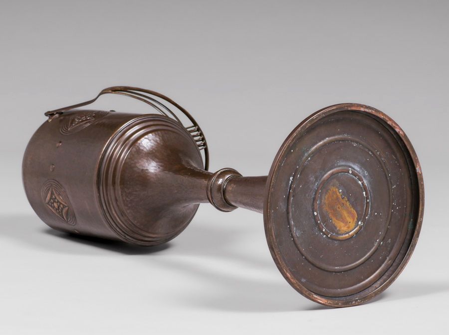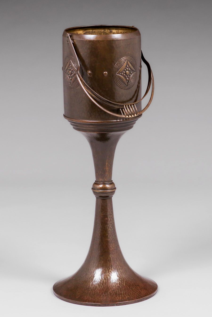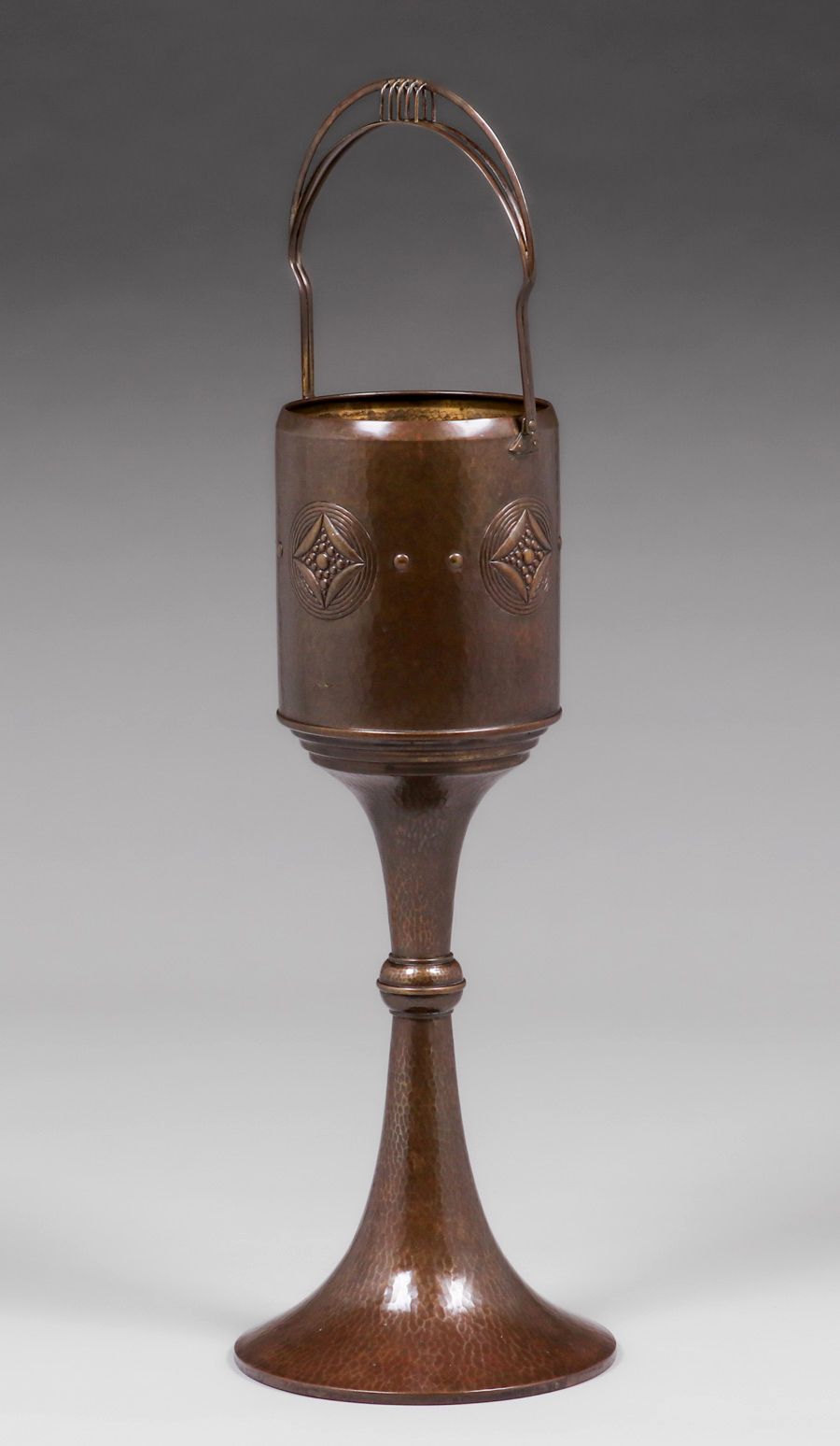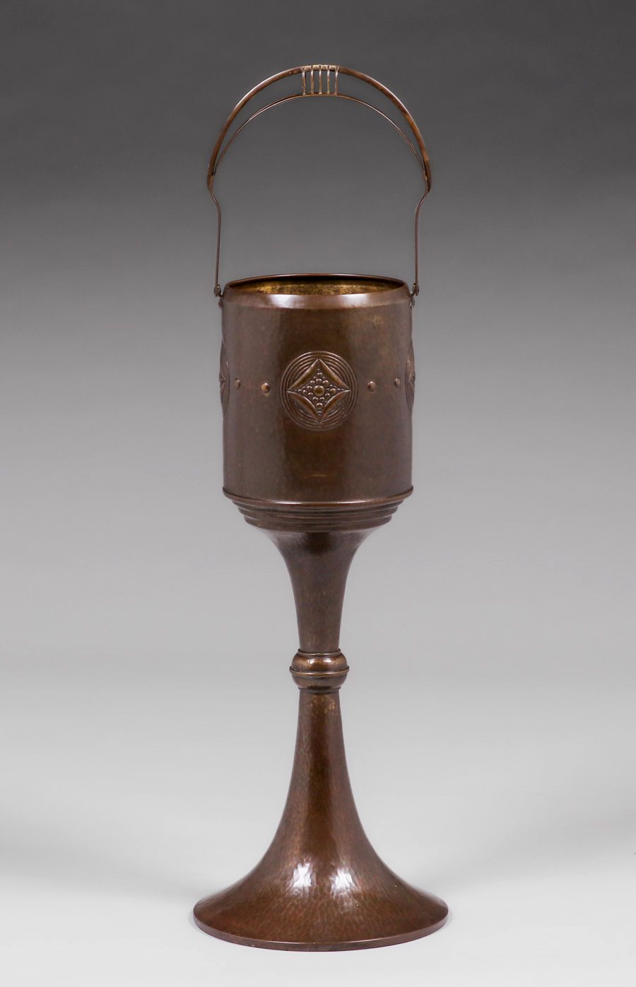 WMF - German Hammered Brass Standing Jardiniere c1905. Signed. Excellent original patina. 28"h (37.5"h with handle) x 9.5"d $2200