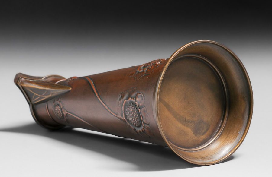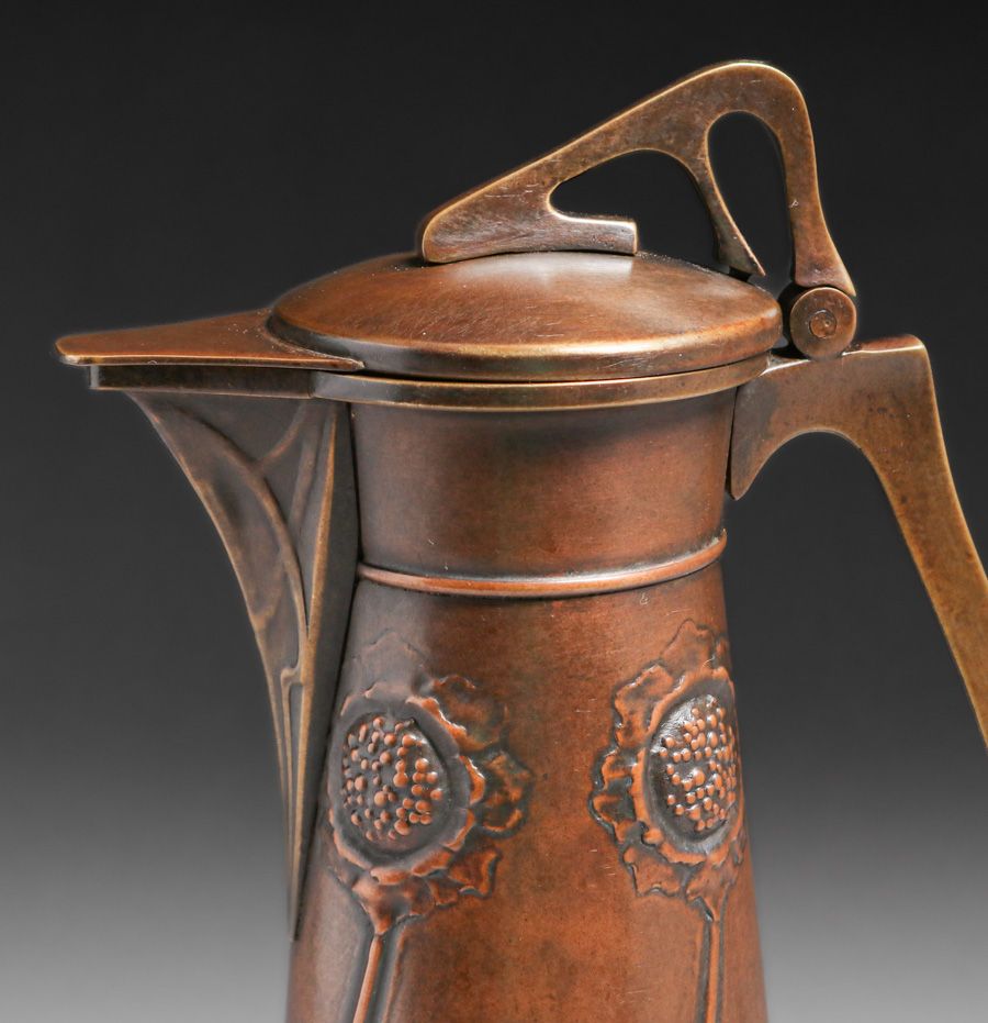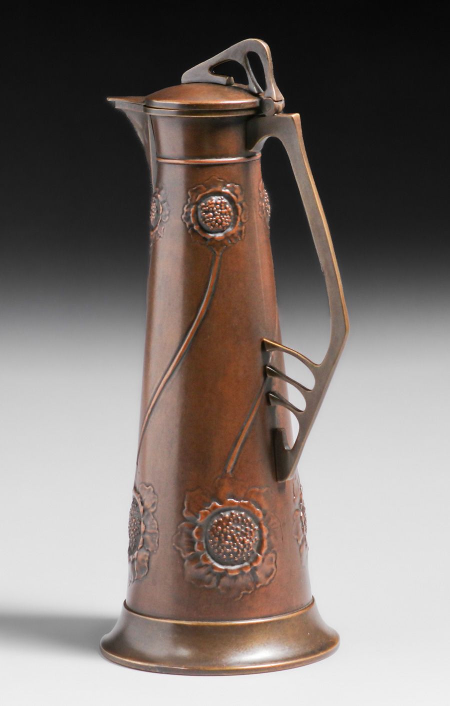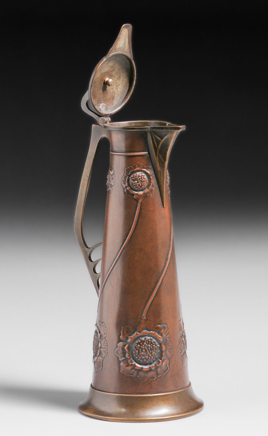 WMF German Hammered Copper & Brass One-Handled Pitcher c1905. Unsigned. Excellent new patina. 14″h x 6″w $950