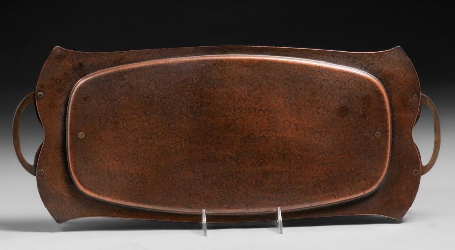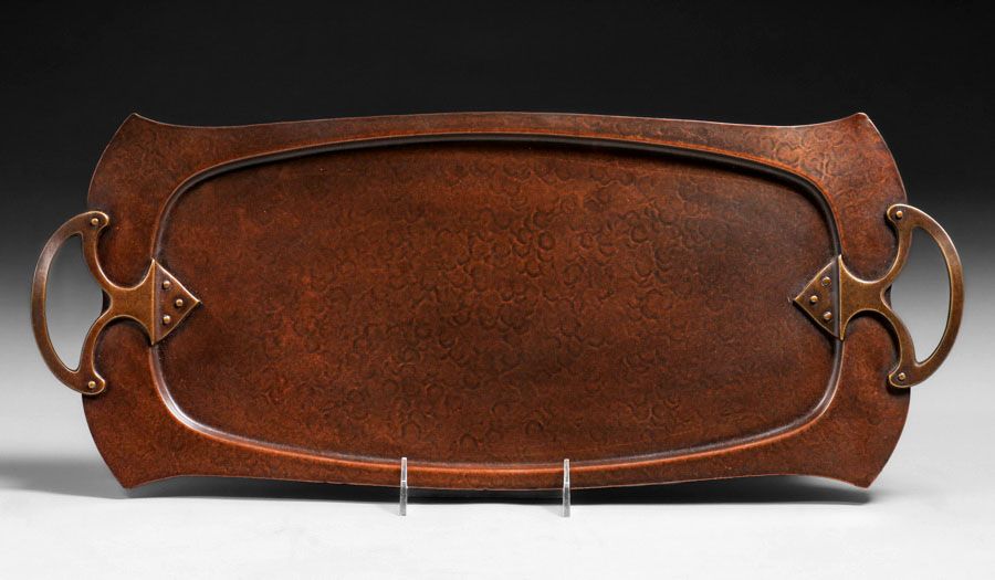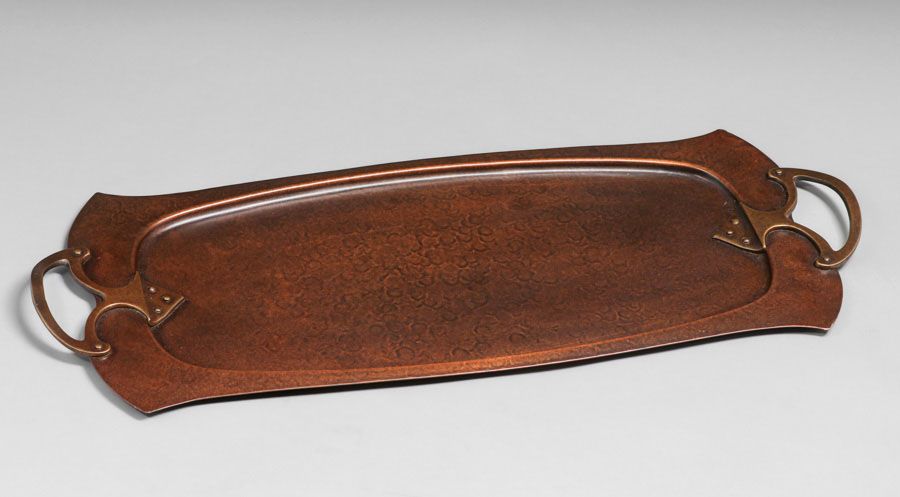 WMF - German Hammered Copper & Brass Two-Handled Tray c1905. Signed. Excellent new patina. 21.25” x 8.5” SOLD