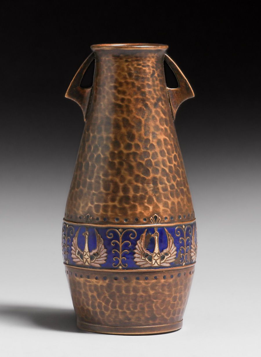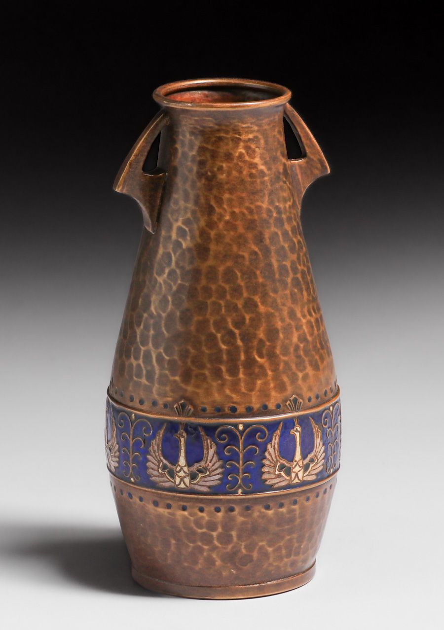 - WMF - German Hammered Copper & Enamel Two-Handled Vase c1905