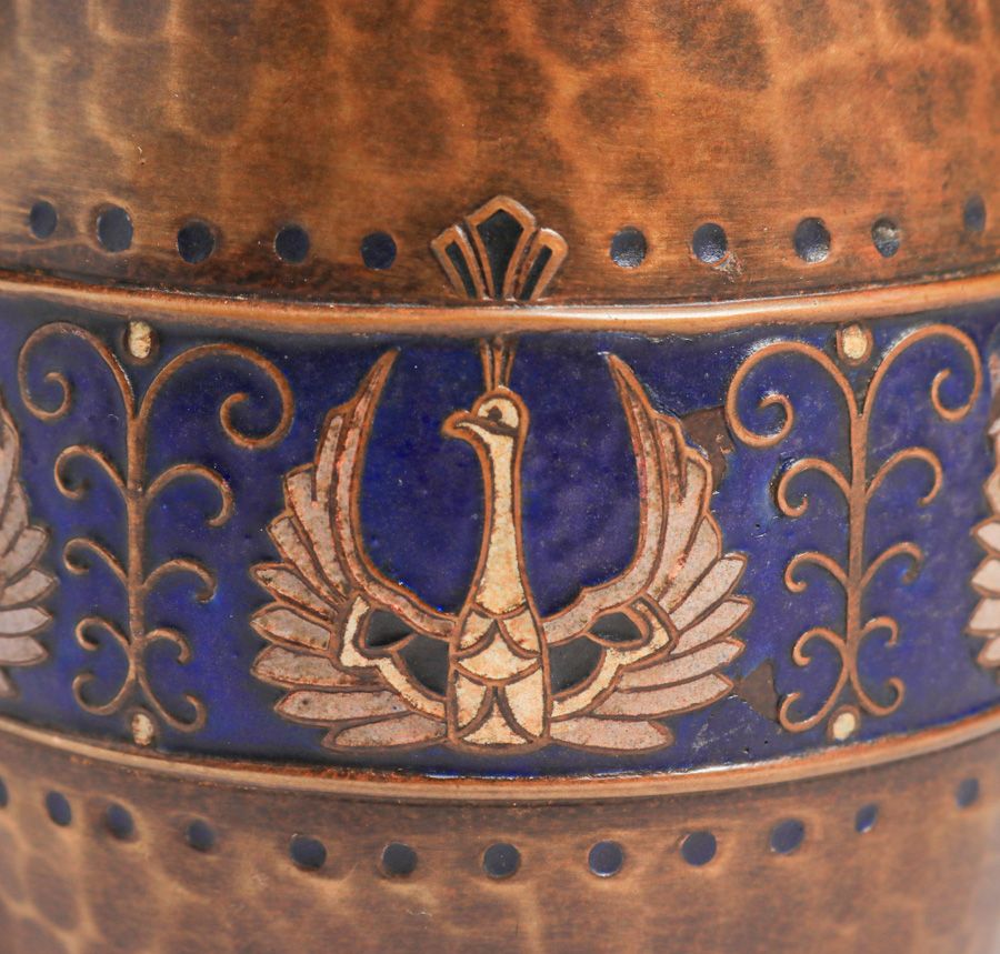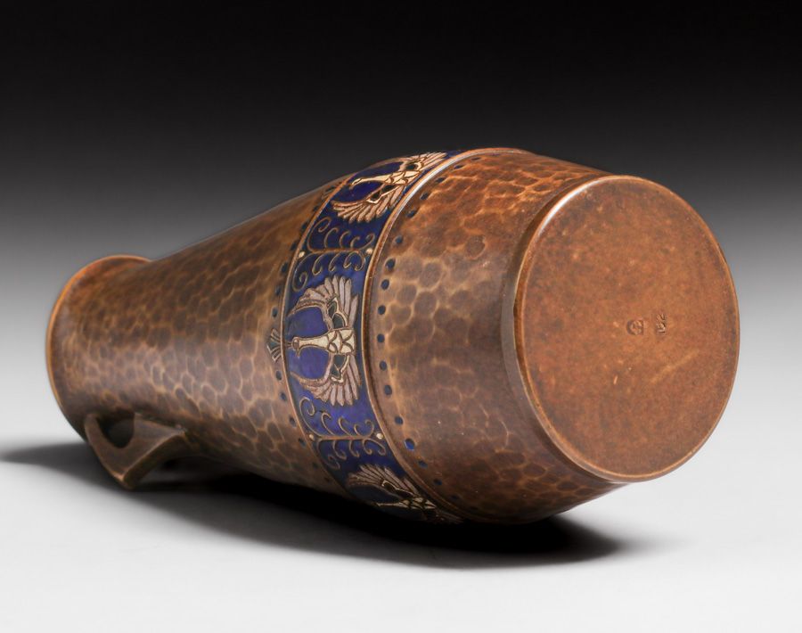 WMF - German Hammered Copper & Enamel Two-Handled Vase c1905. Signed. Excellent new patina. 7.5”h x 3.25”w $1200