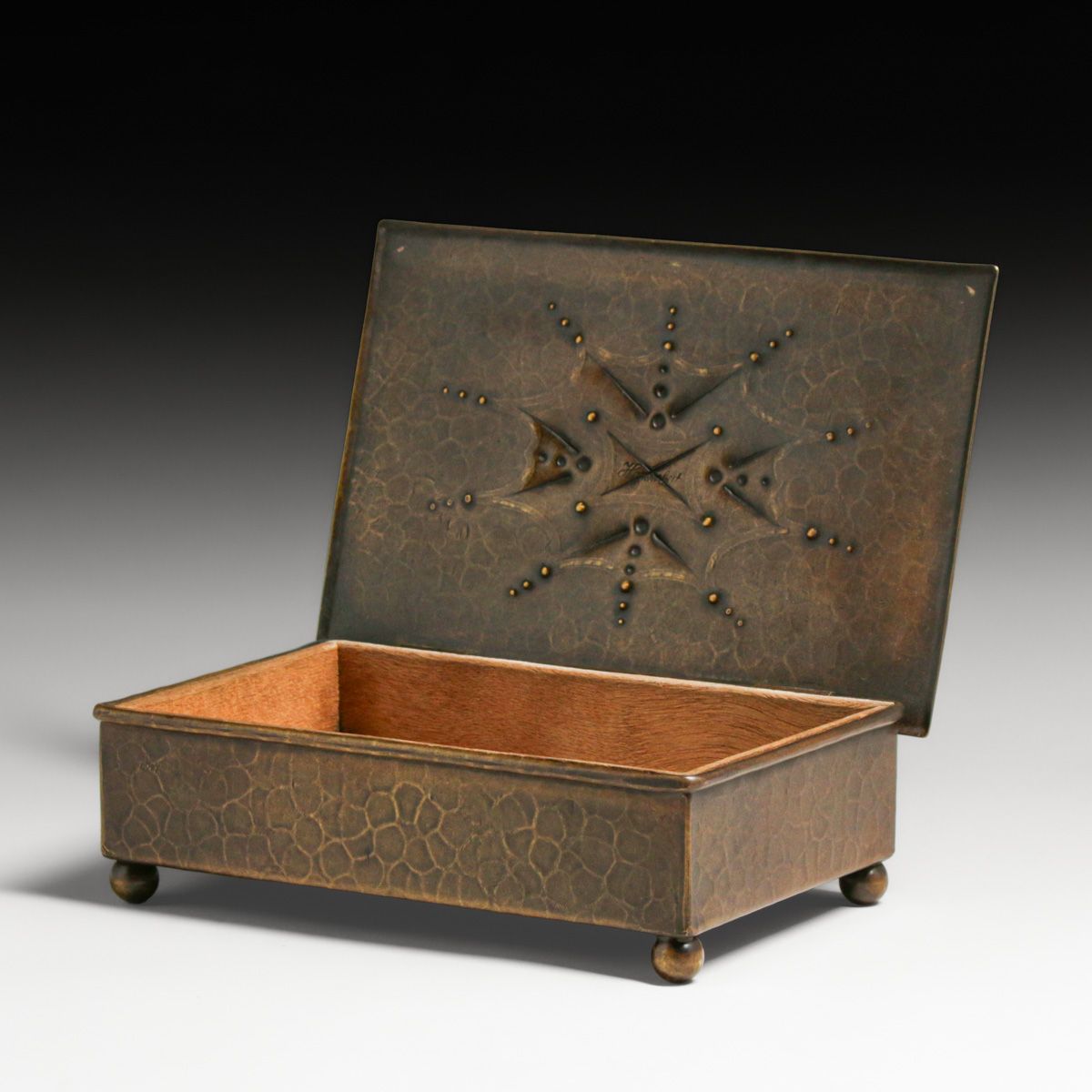 WMF - German Repousse Hammered Brass Box c1905. Marked "Handarbeit" meaning Handmade, otherwise unsigned. Excellent new patina.