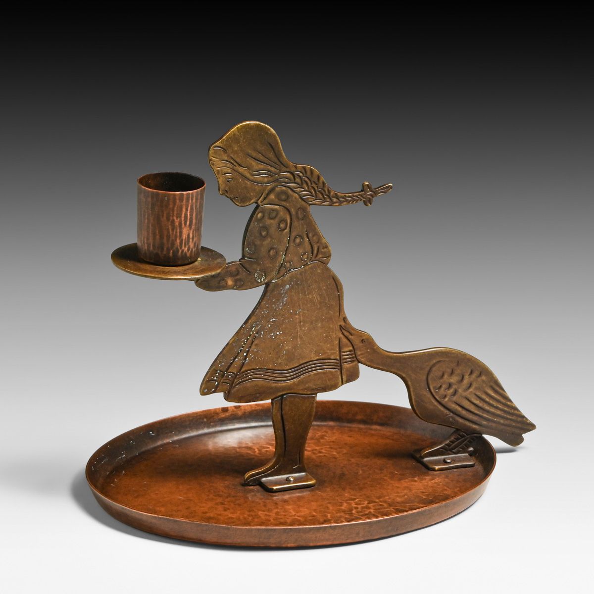 WMF - Ignatius Taschner Designed Art Nouveau "Goose Girl" Mixed-Metal Chamberstick c1910. Signed. Excellent new patina. 6"h x 7.5"