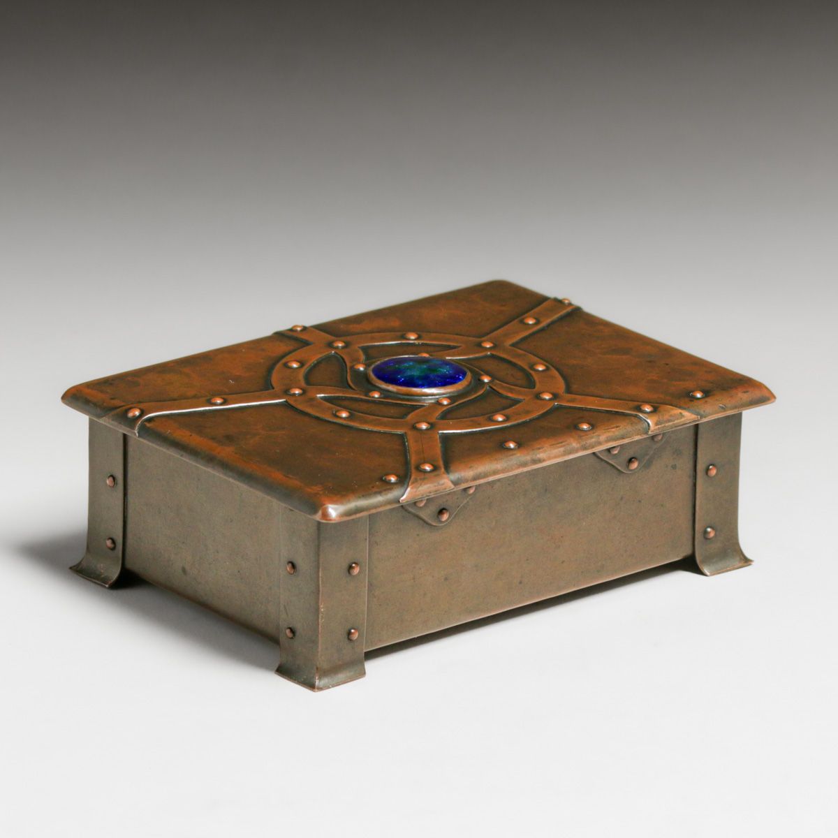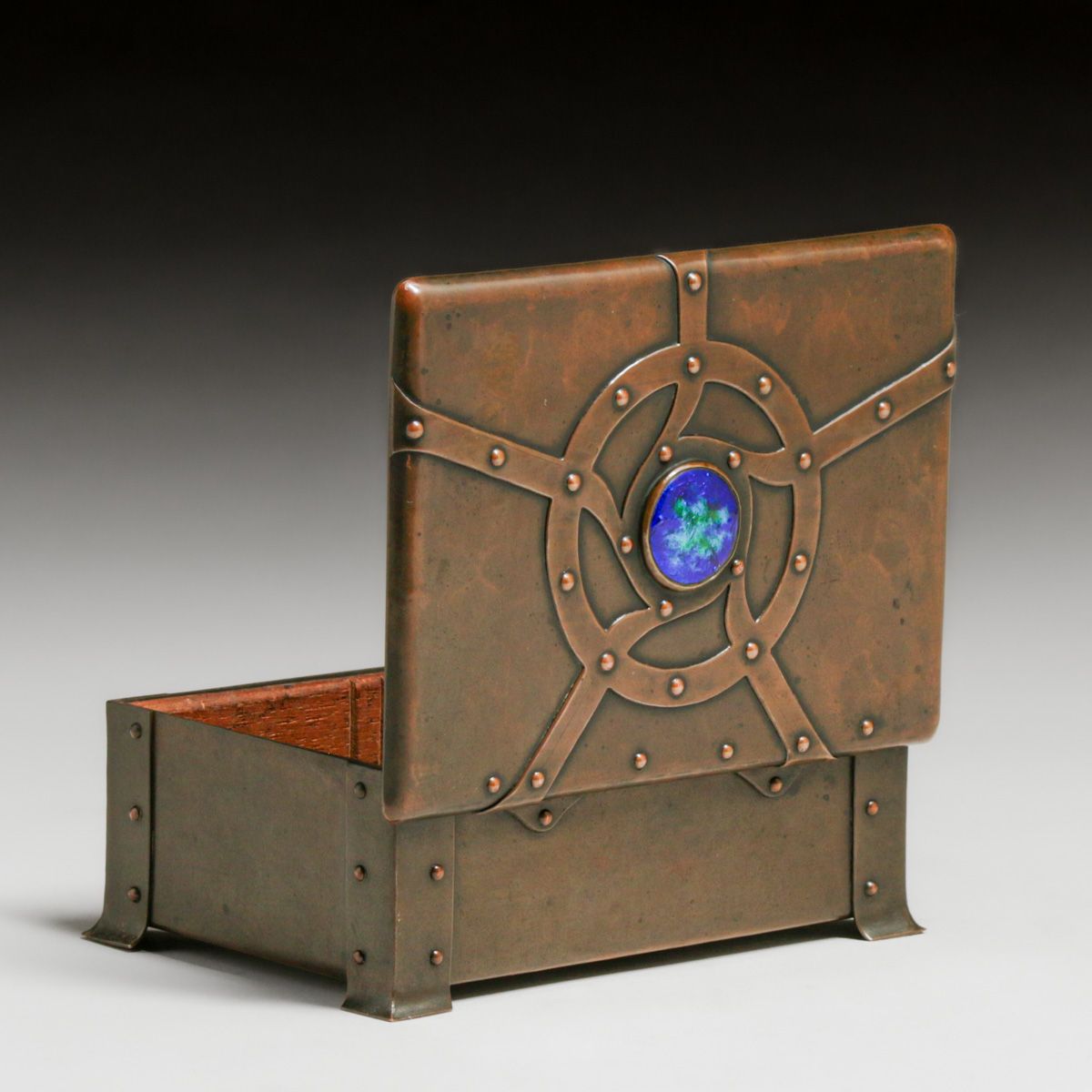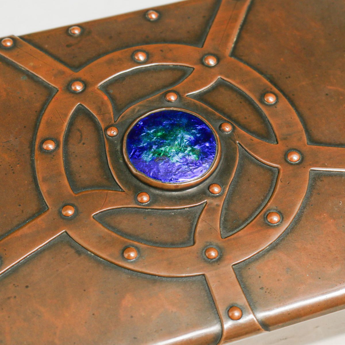 - Albert Edward Jones Hammered Copper & Enamel Strap Riveted Box c1900s