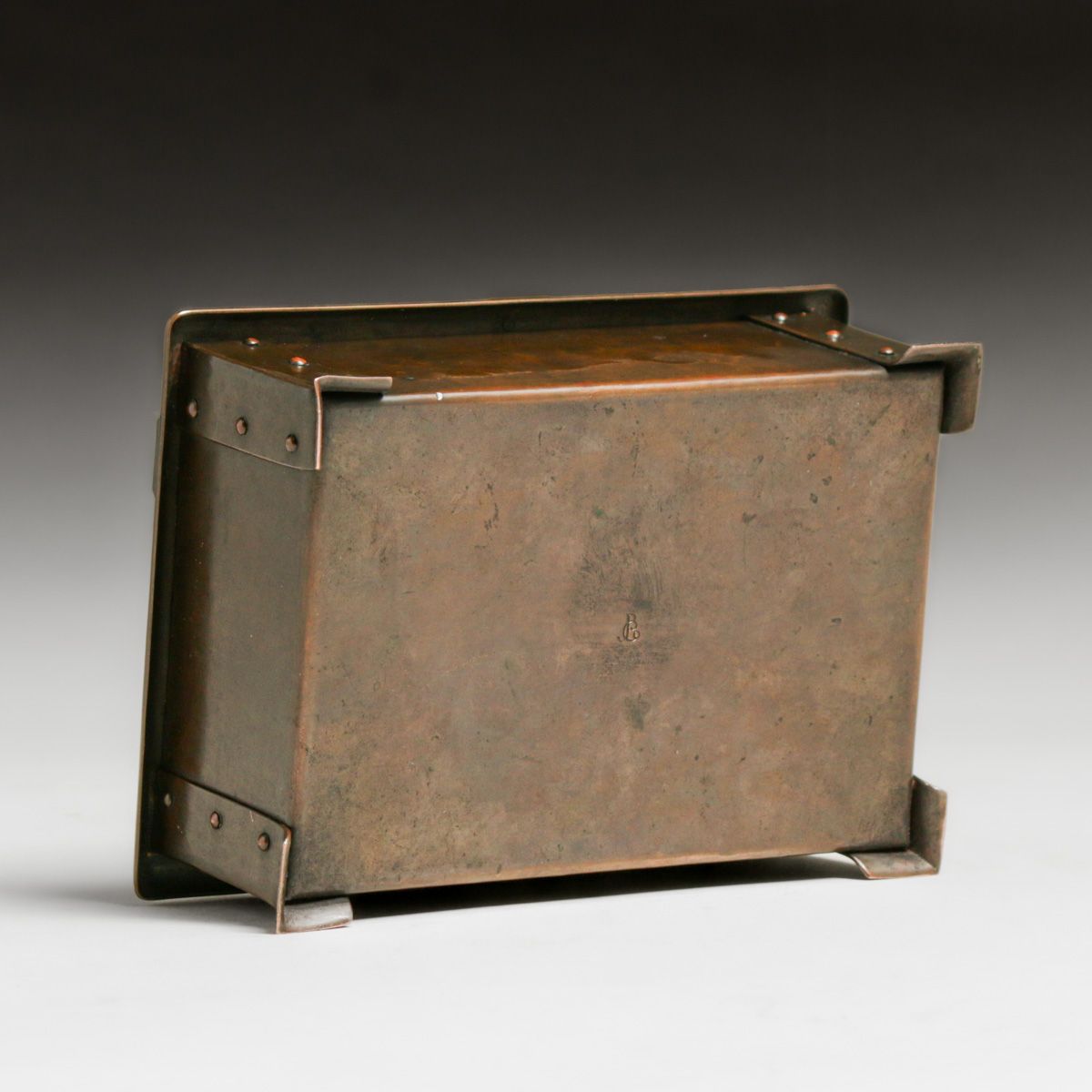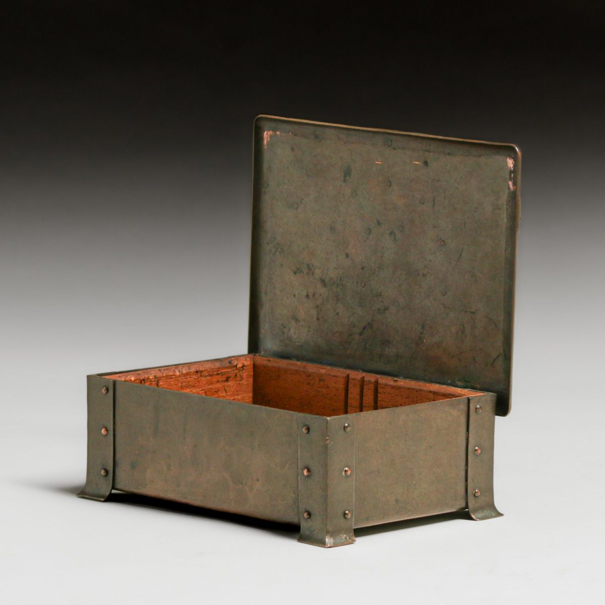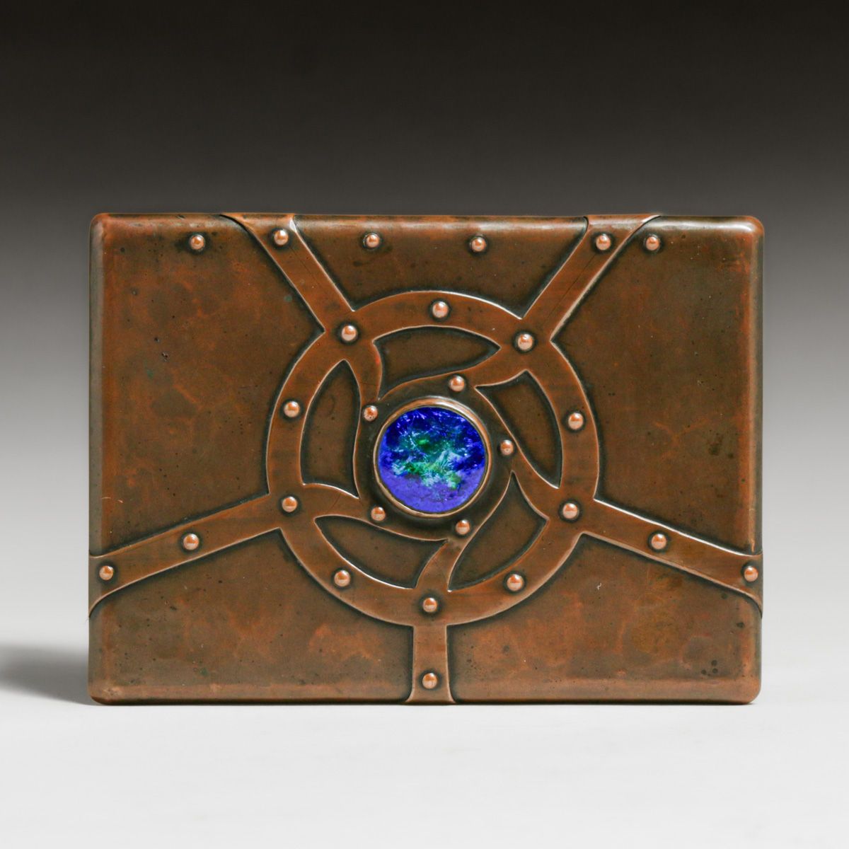 - Albert Edward Jones Hammered Copper & Enamel Strap Riveted Box c1900s