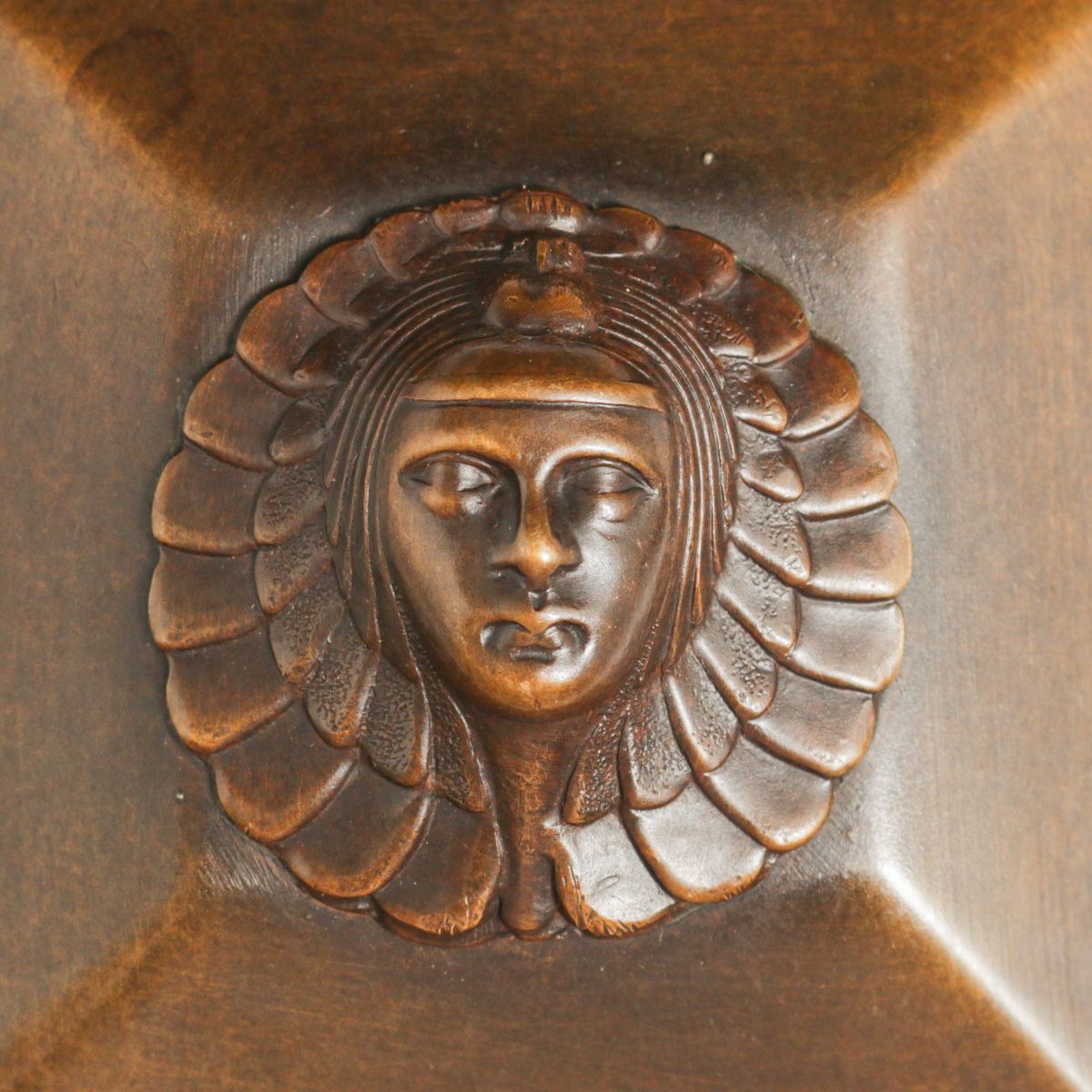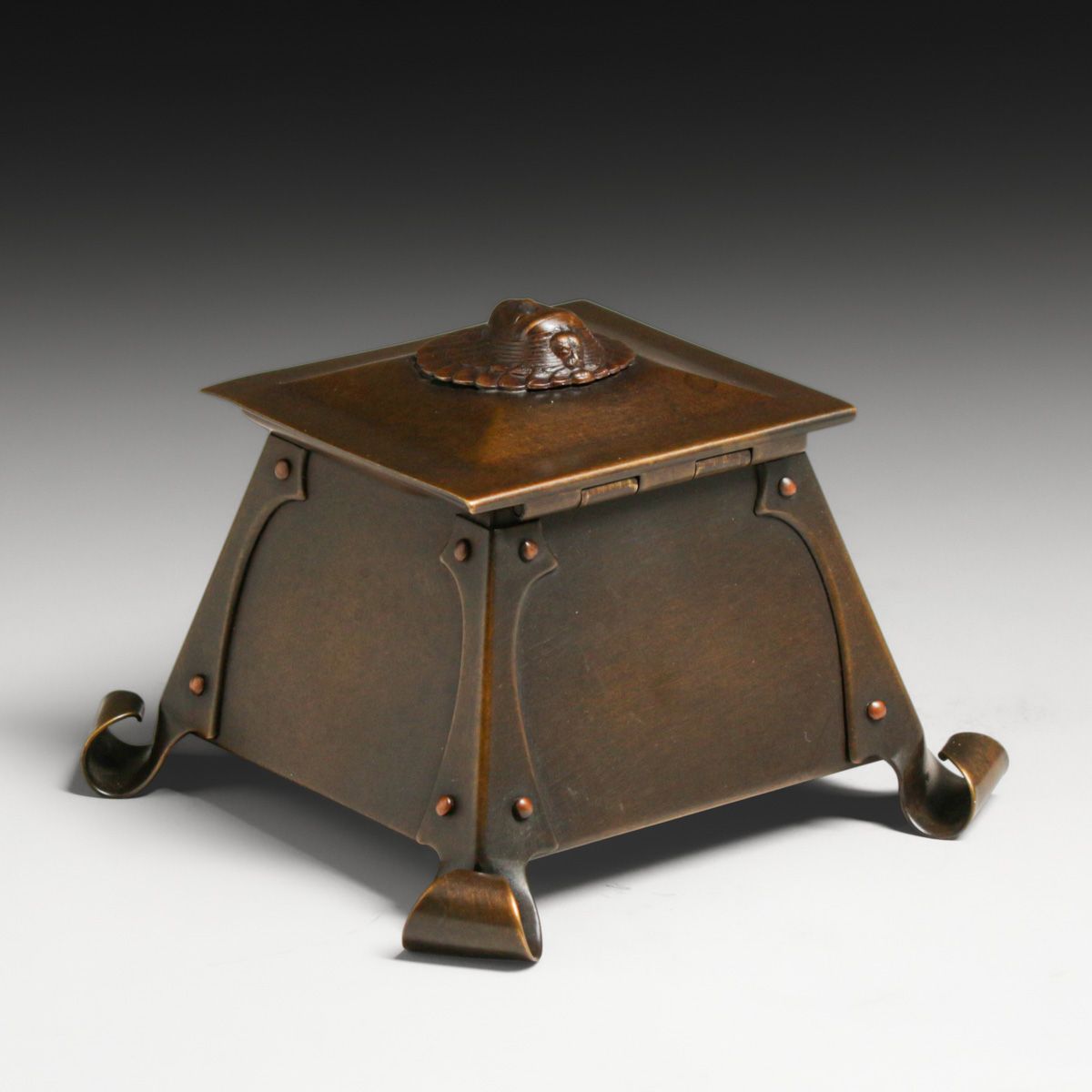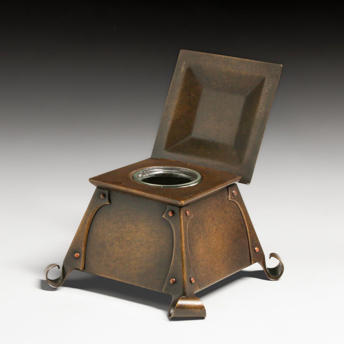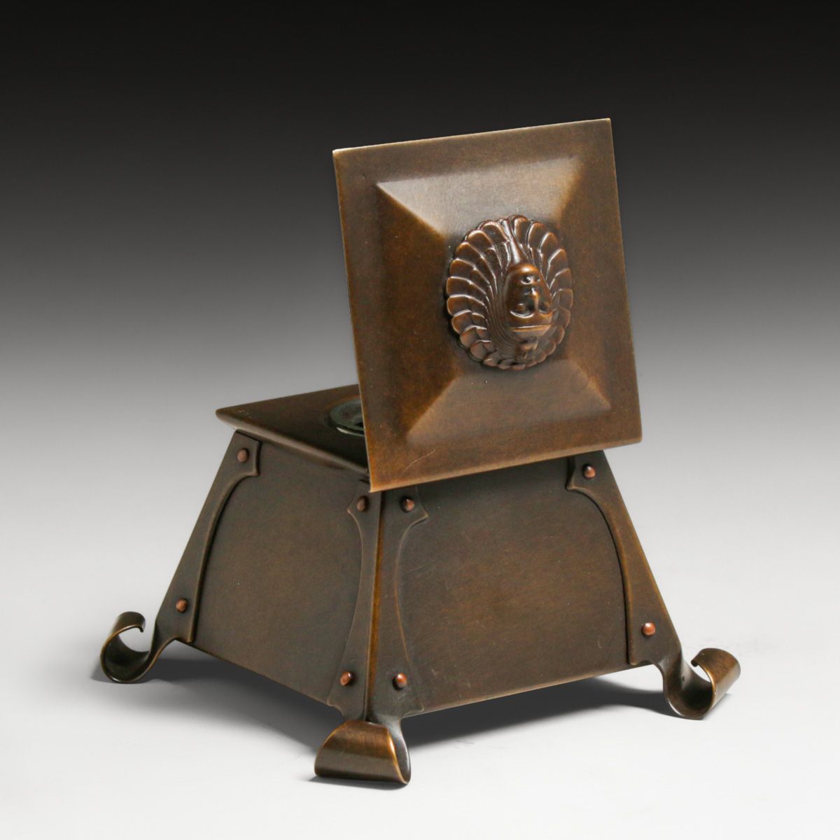 Unusual Art Crafts Shop - Buffalo Copper Inkwell c1910. Unsigned. The form is an Art Crafts Shop form, but the motif on top is more similar to Bradley & Hubbard. Unsigned. Excellent new patina. 5.25" x 5.25" x 3 7/8"h