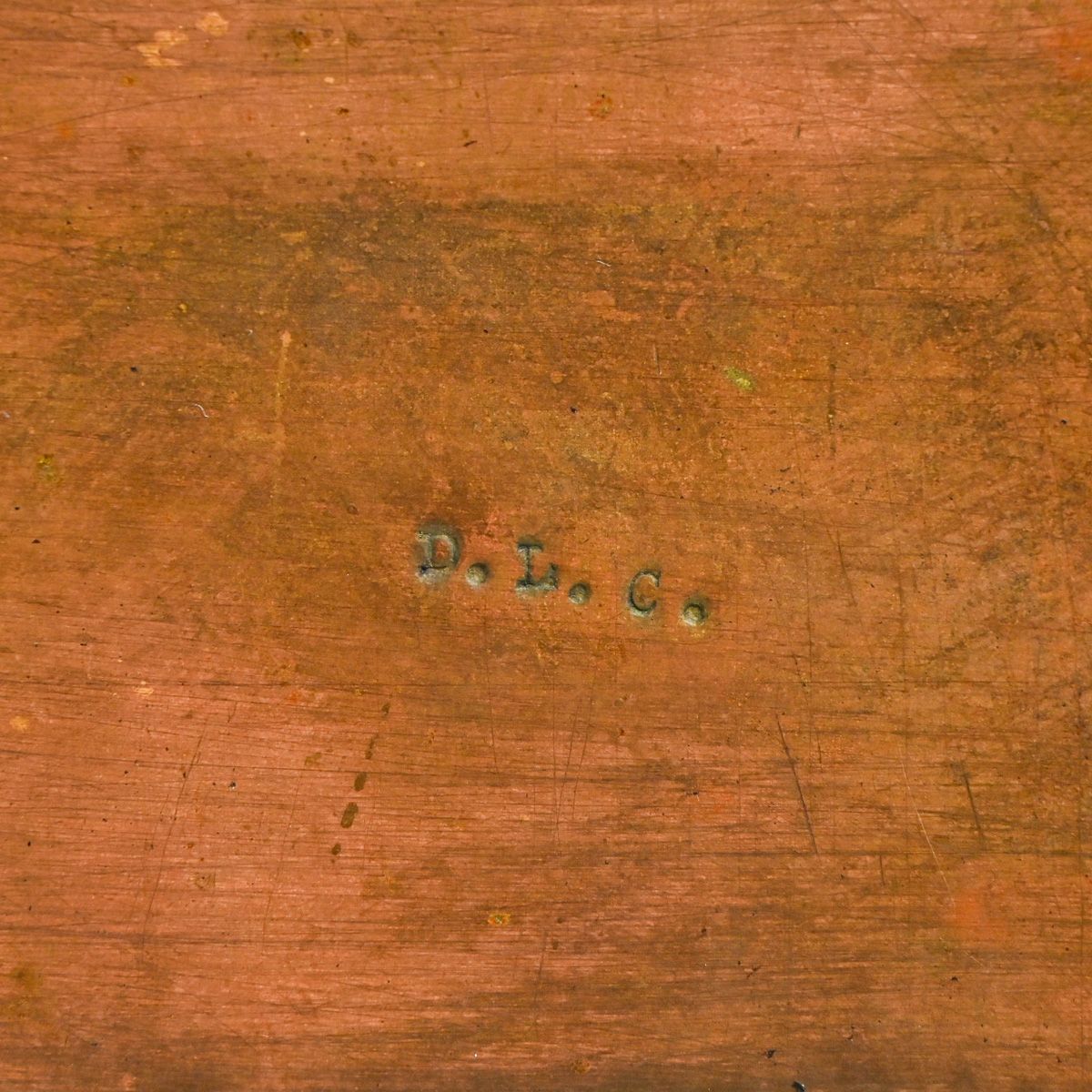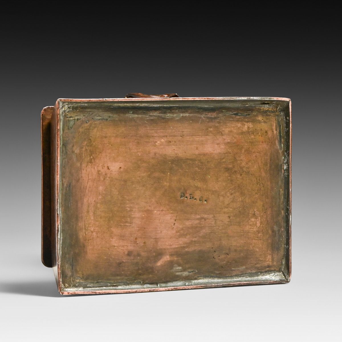 Arts & Crafts Period Copper Strap-Hinge Box c1920. Signed "D.L.C." Excellent original patina. 4 5/8"w x 3 1/8"d x 1 1/8"h