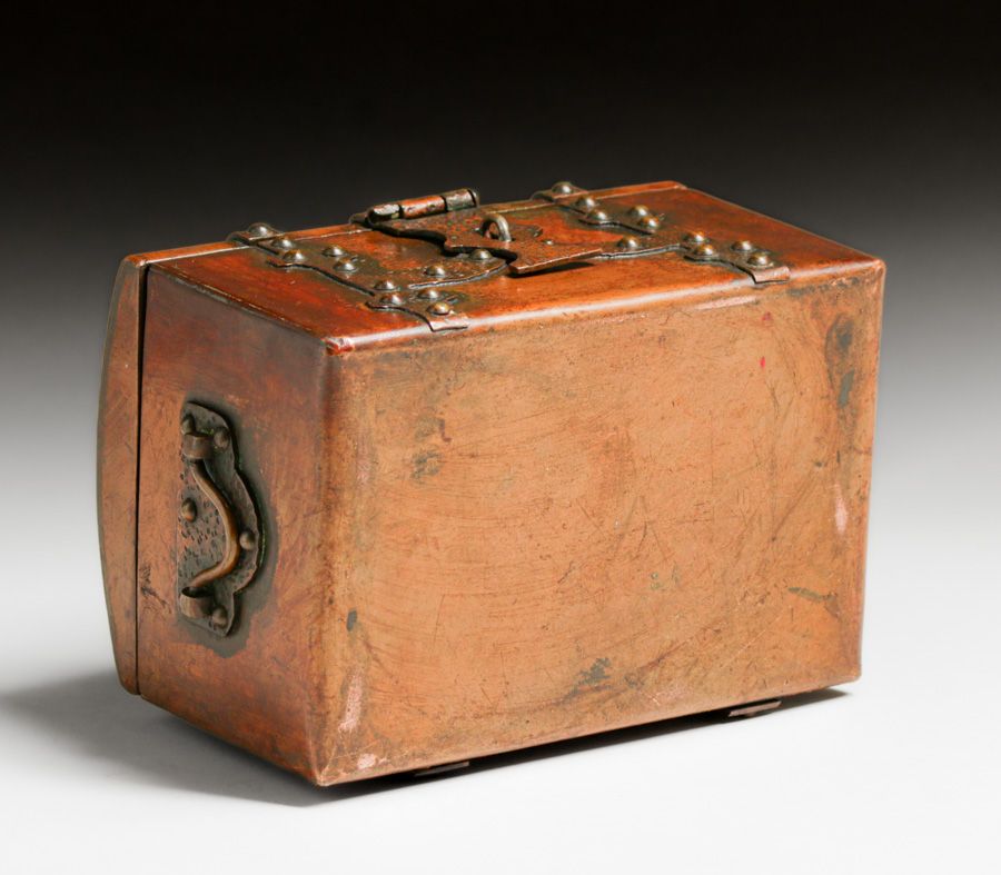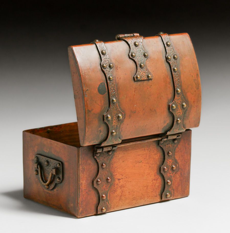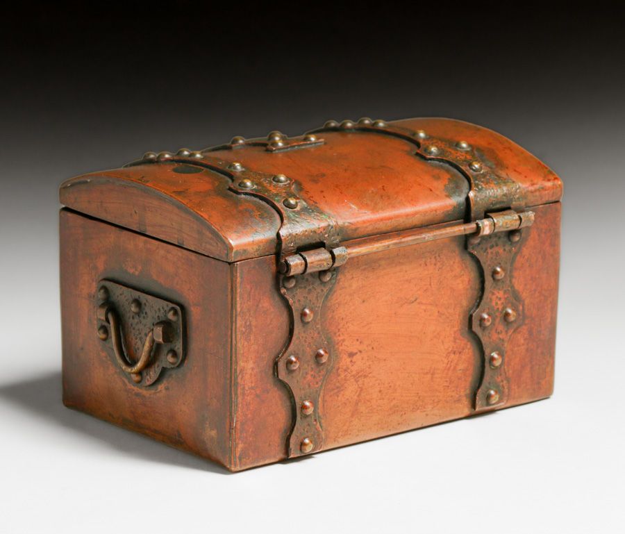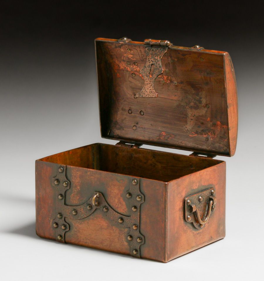 Arts & Crafts Period Hammered Copper & Brass Strap-Hinge Box c1910. Unsigned. Excellent original patina. 4"h x 6.5"w x 4.5"d