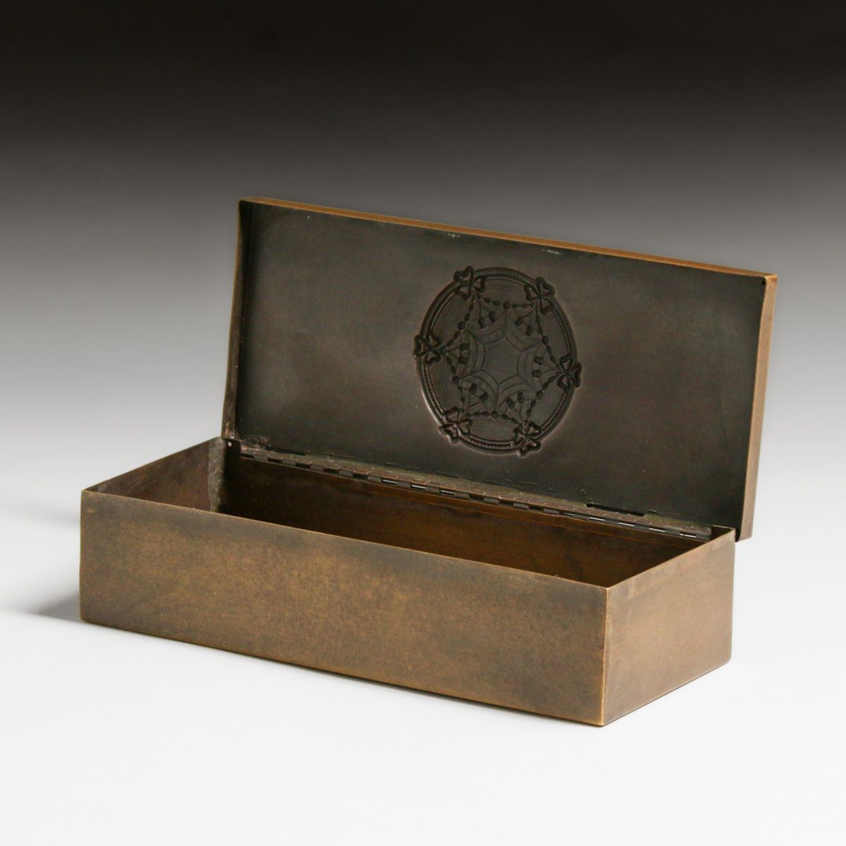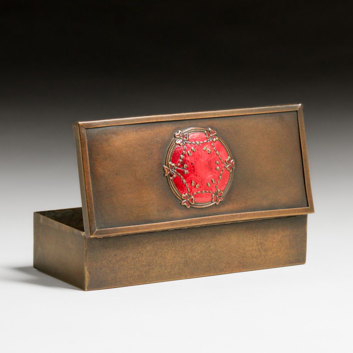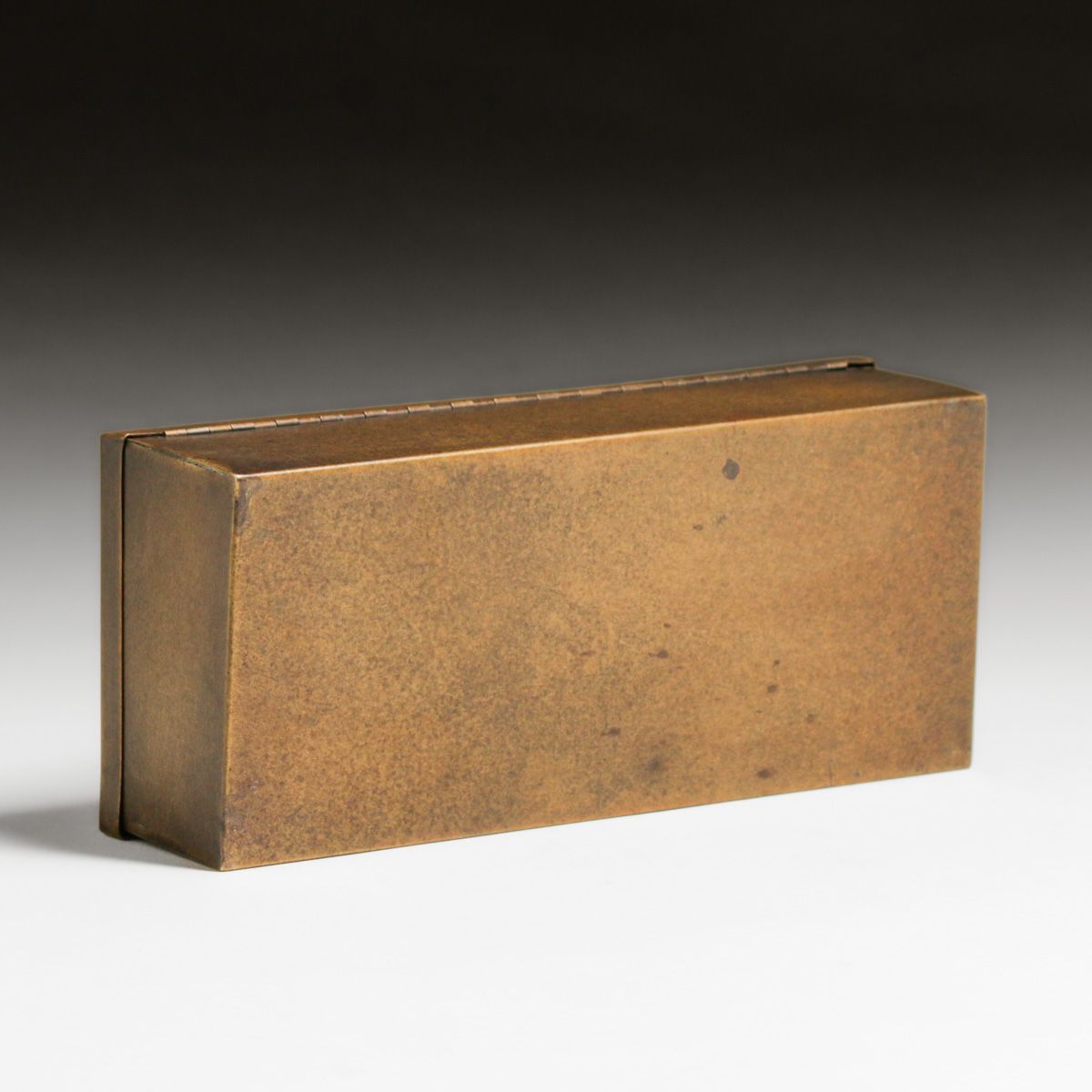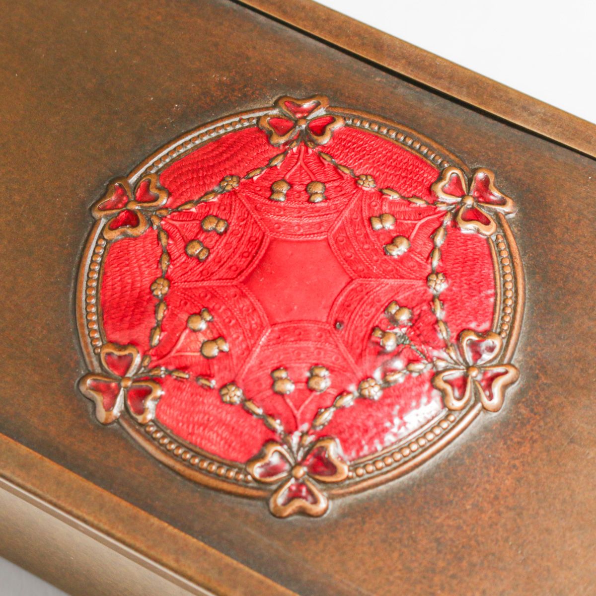 English Arts & Crafts Brass & Enamel Box c1900s. Unsigned. Excellent new patina. 1.75"h x 7.25"w x 3.25"d